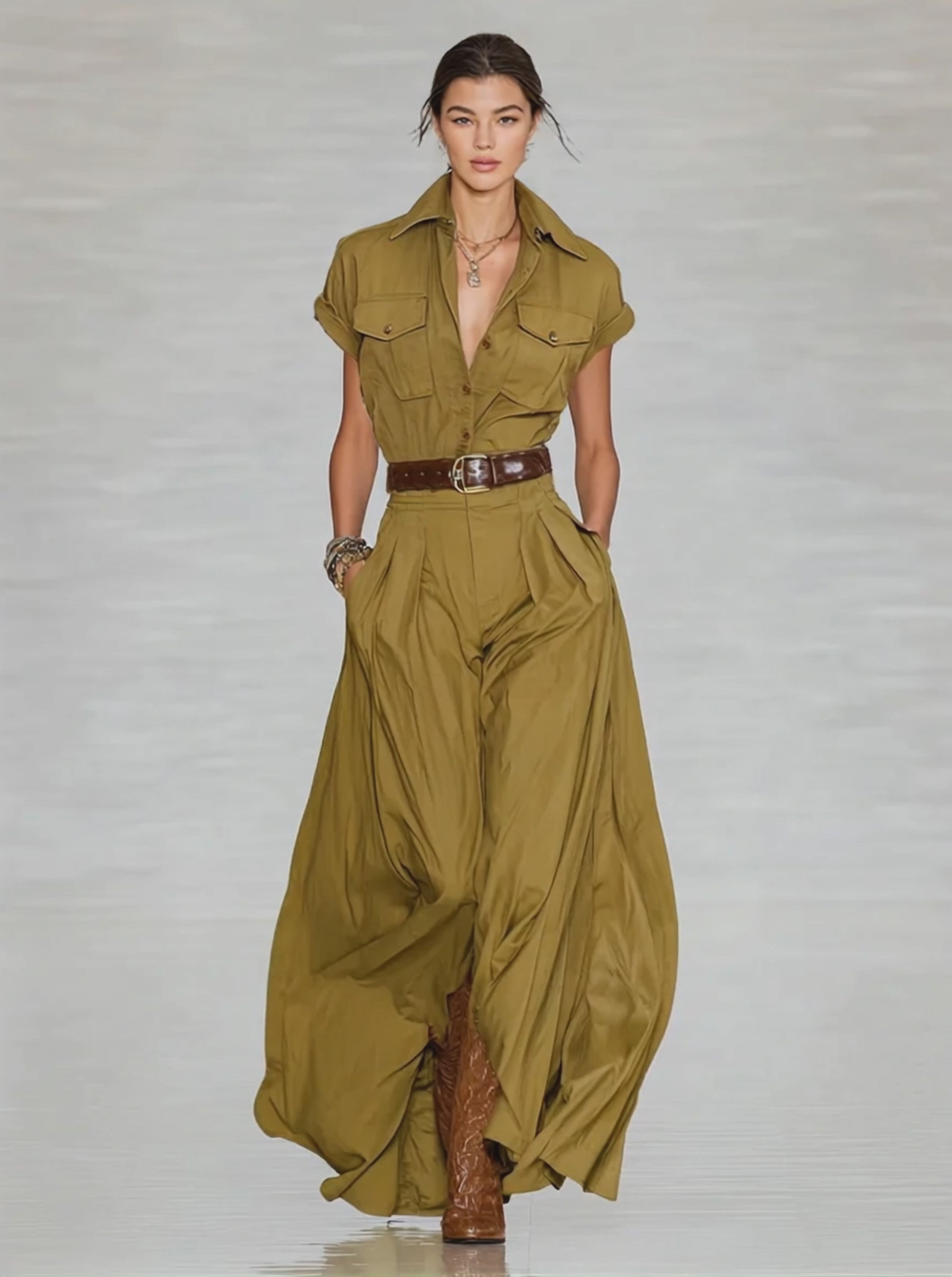 Women's Cotton Blend Lapel Single-breasted Short-sleeved Shirt Maxi Dress MDA1876G9Y