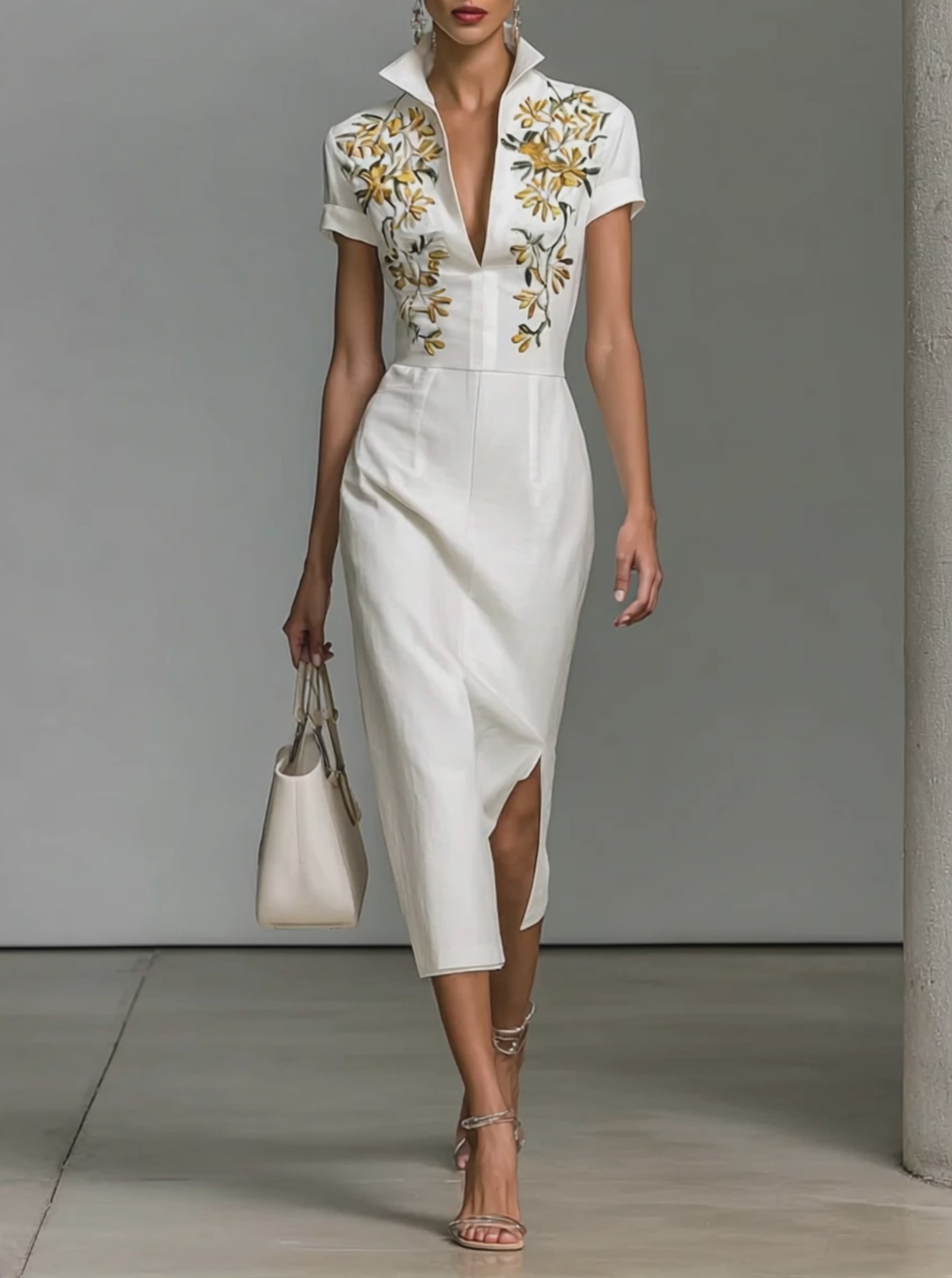 Women's Embroidered V-Neck Short Sleeve Waist Midi Dress MDA0535G0Y