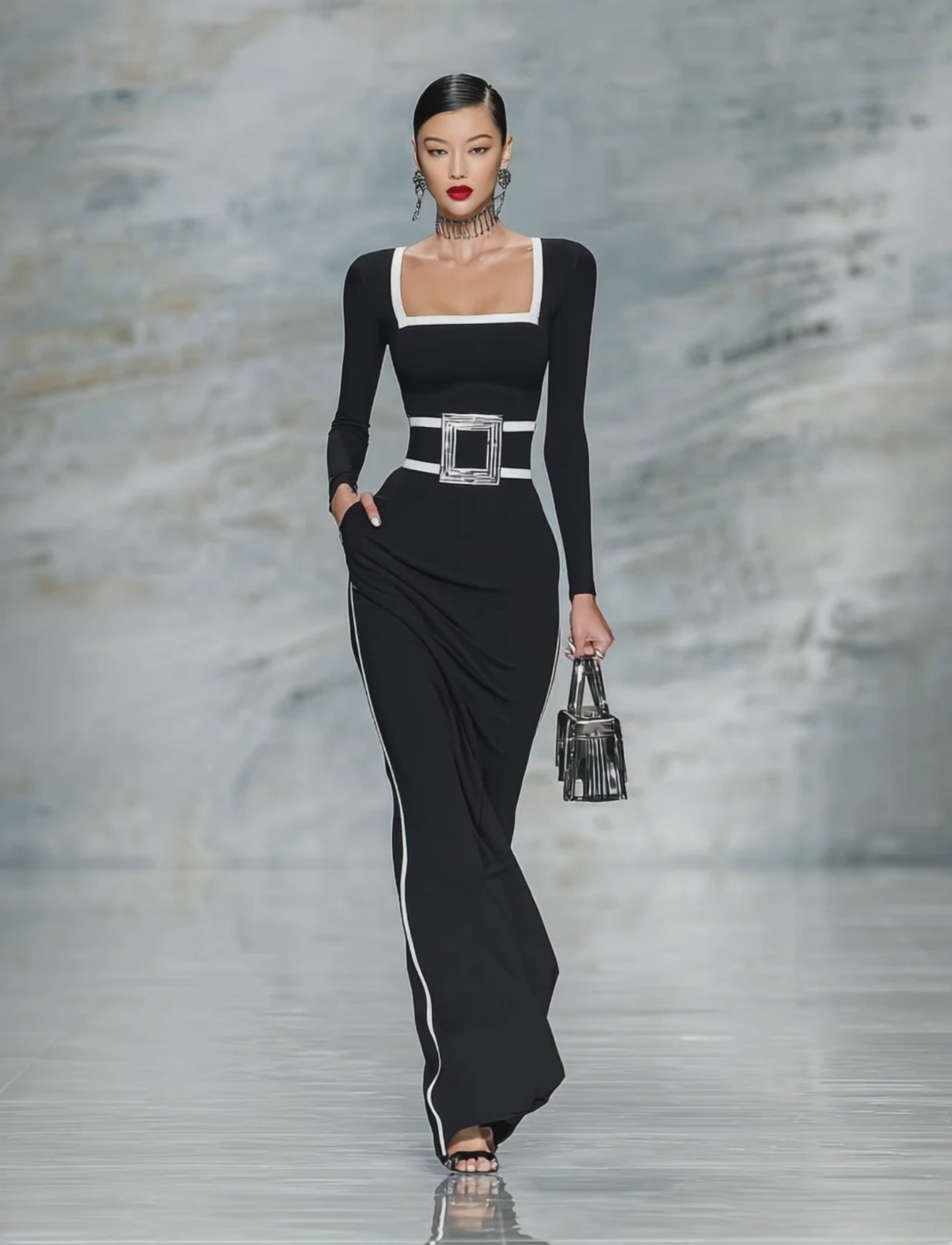 Women's Black And White Trim Square Neck Long Sleeve Tight Maxi Dress MDA1698G8Y