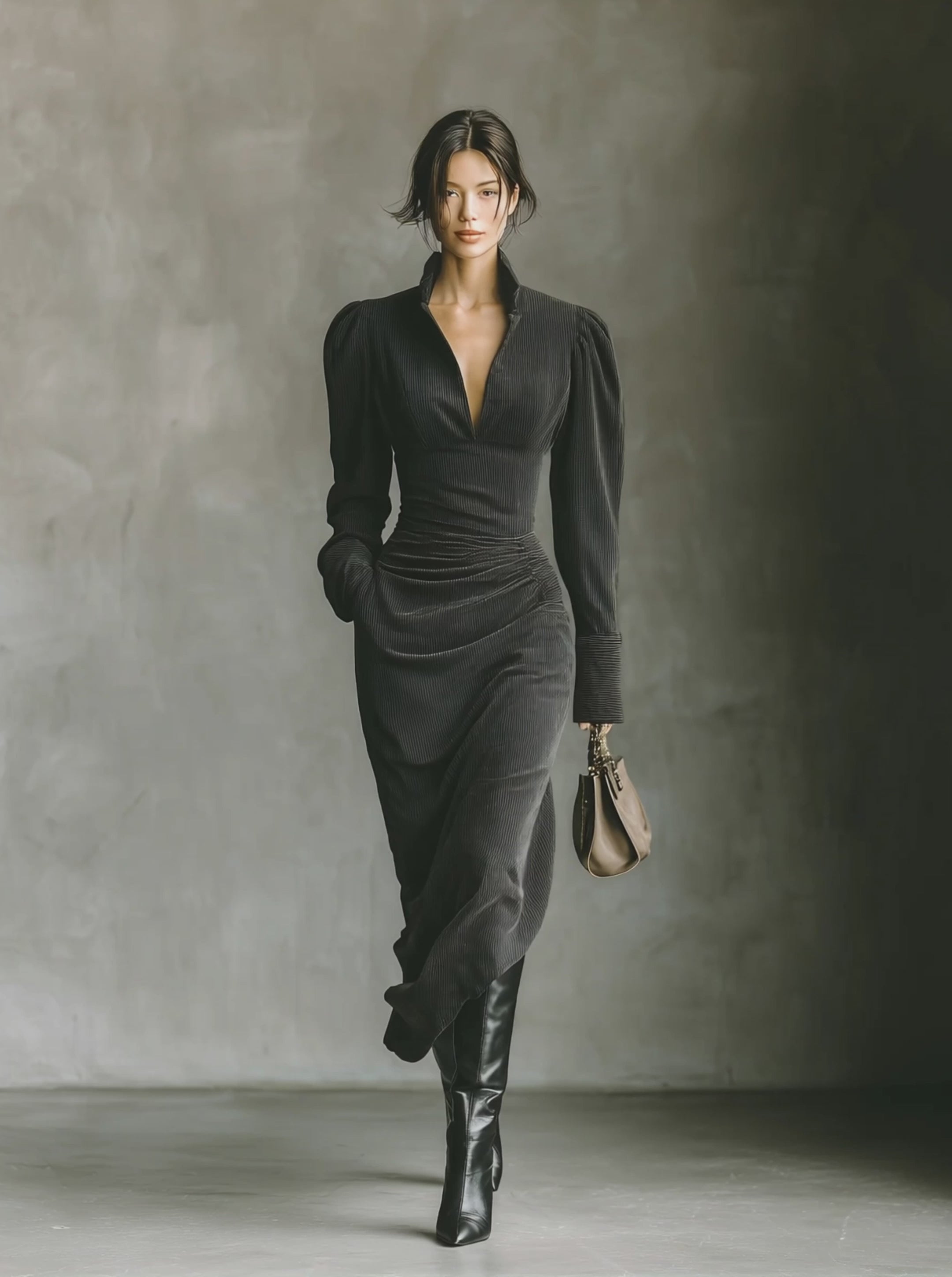 Women's Corduroy V-neck Waist Maxi Dress MDA0132H2T