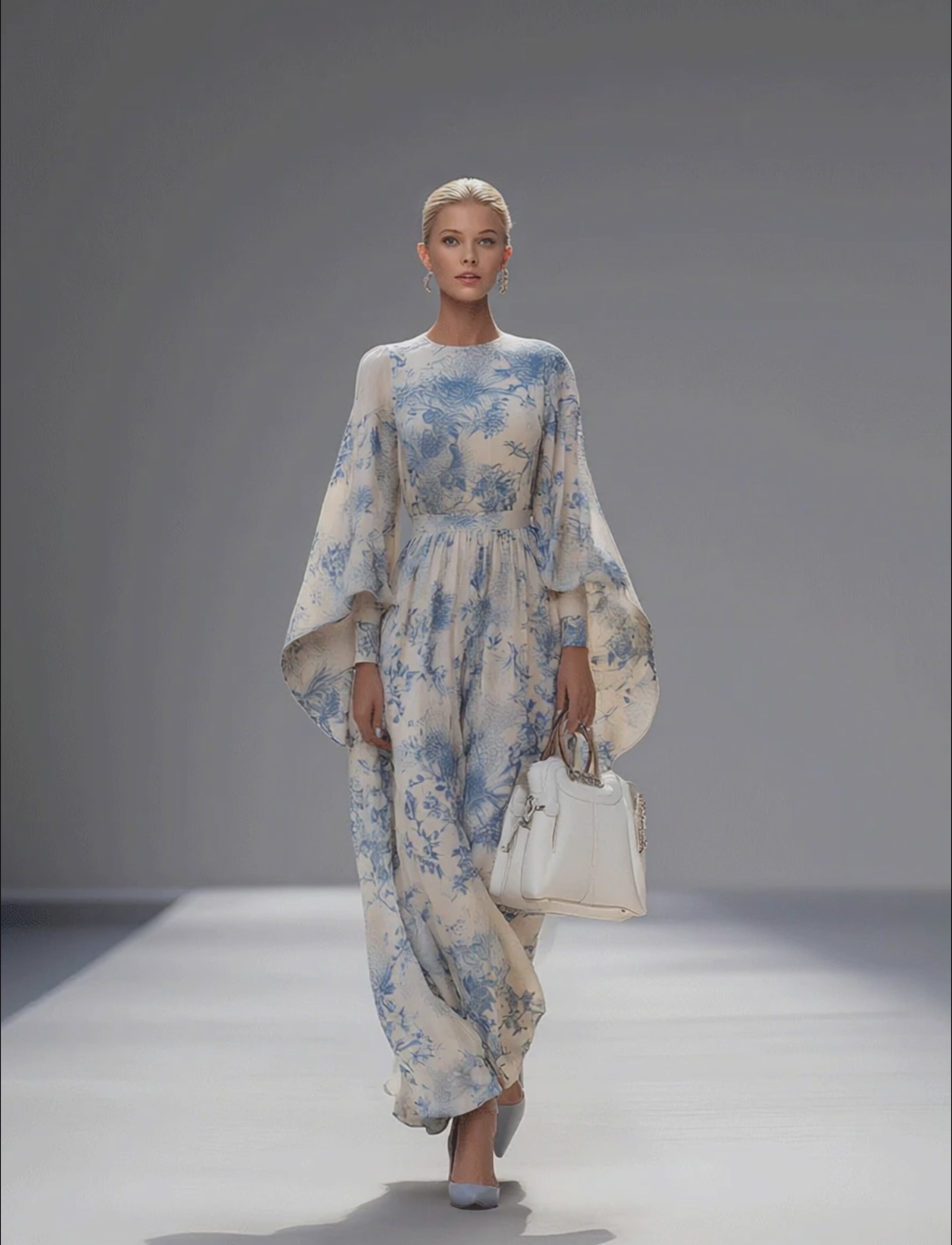 Women's Elegant Blended Printed Bell Sleeve High Waist Maxi Dress MDA3069G1I
