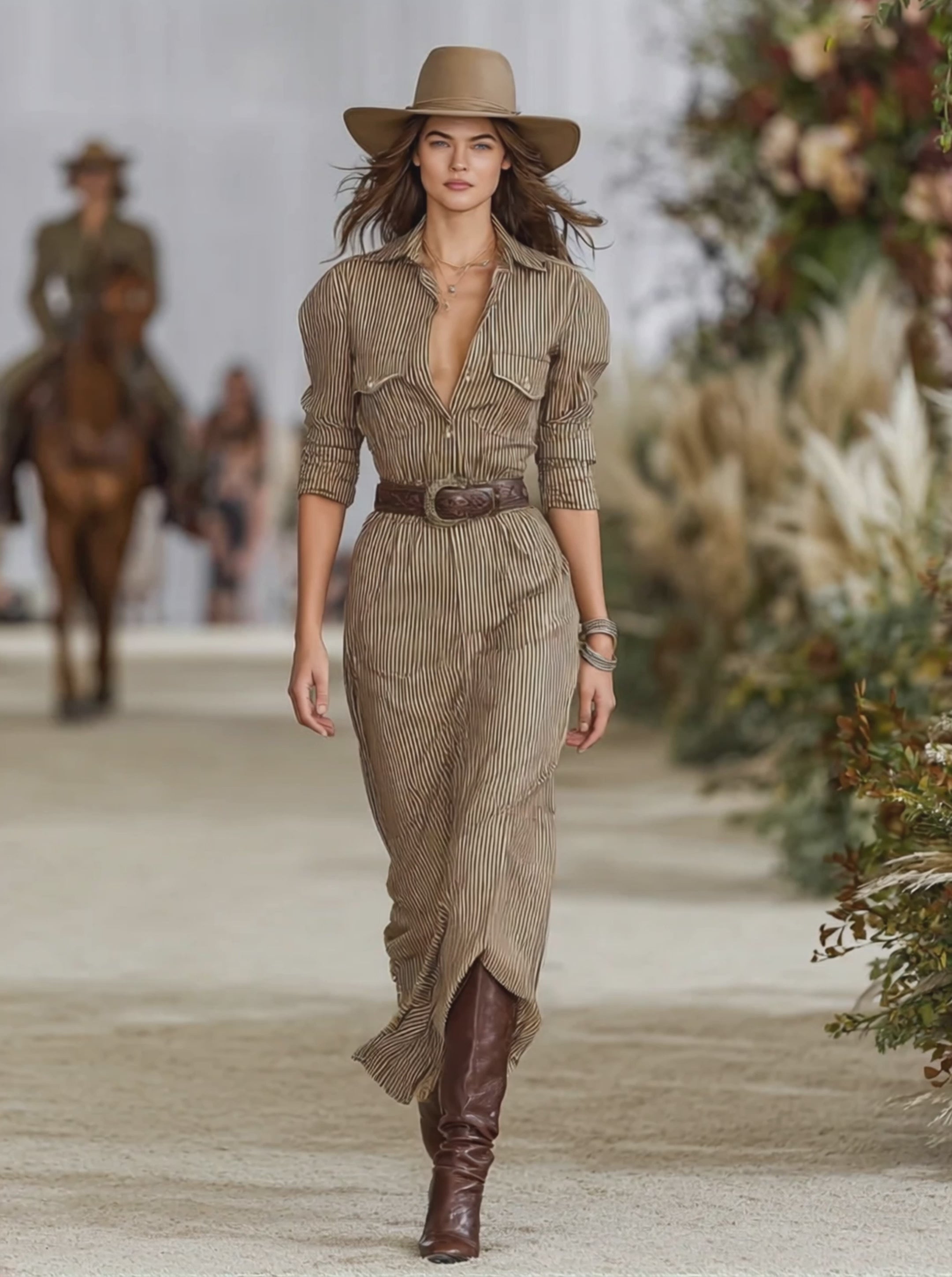 Women's Striped Lapel Single-breasted Long-sleeved Waist Maxi Dress (without Belt)MDA1846G0Y