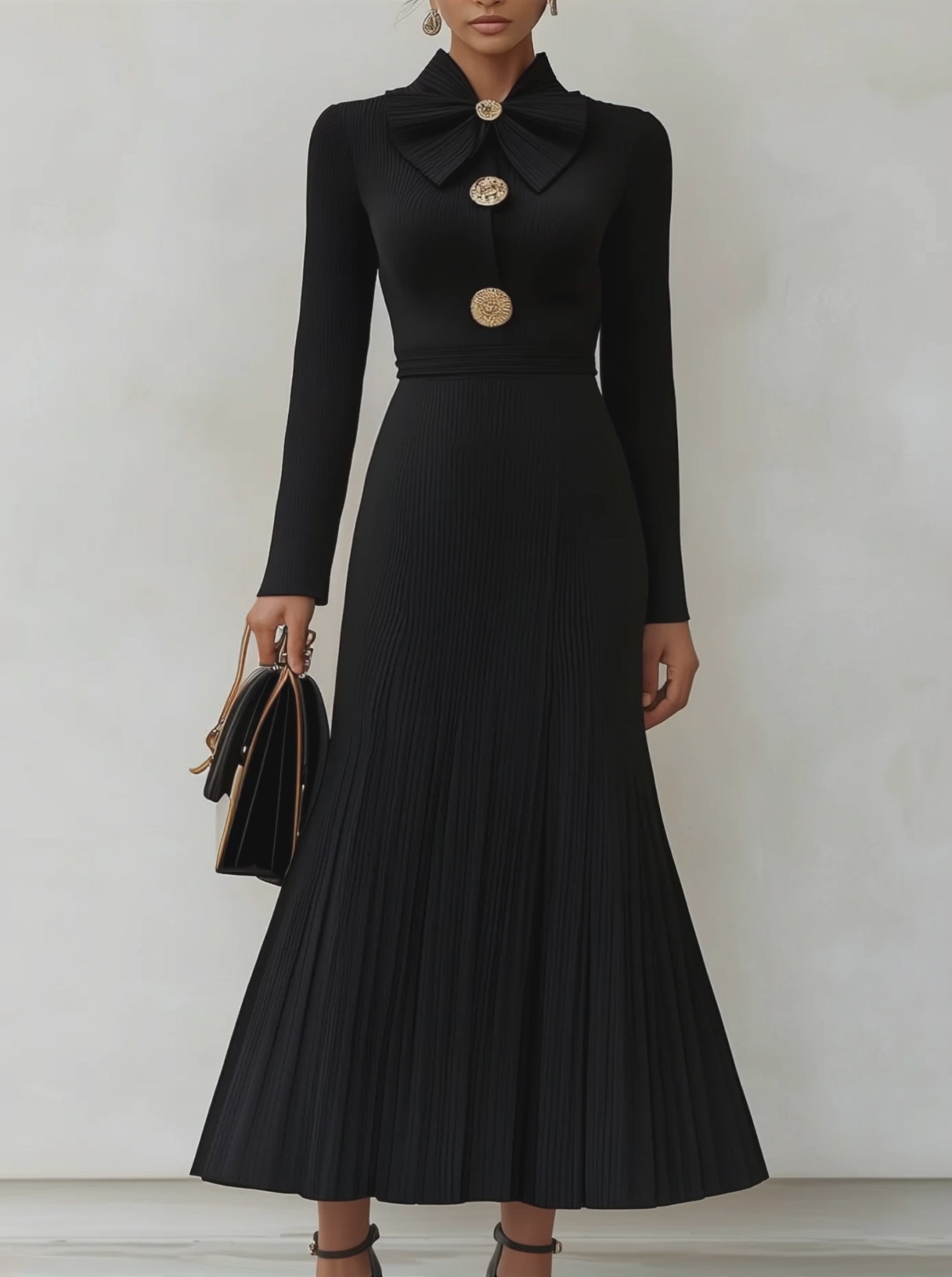 Women's Elegant Retro Bowknot Neckline Gold Buttons Black Knitted Dress MDA0203H8I