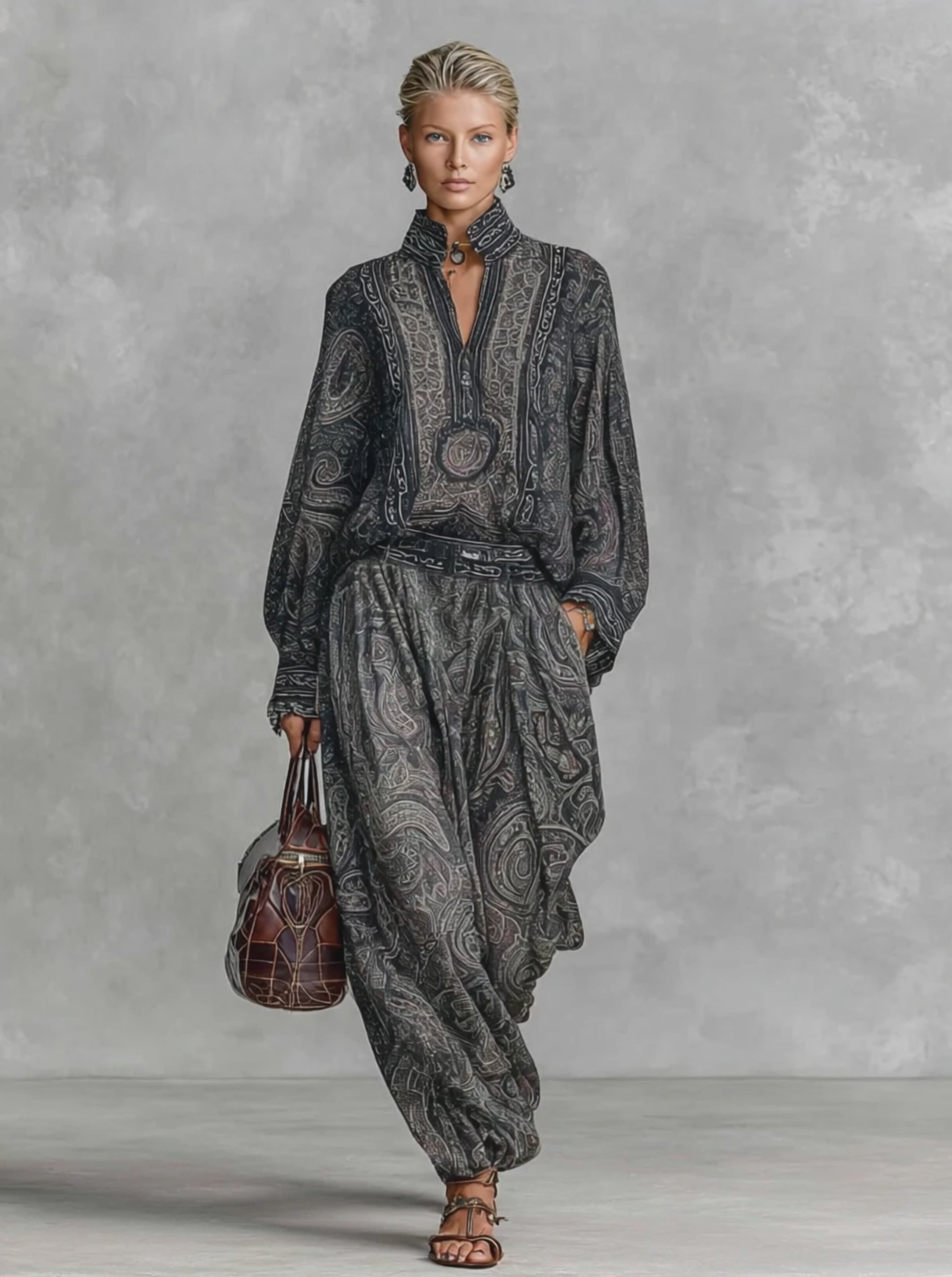 Women's Vintage Paisley Print Stand-up Collar Long Sleeve Shirt Trousers Two-piece Set MDA2558G3Y
