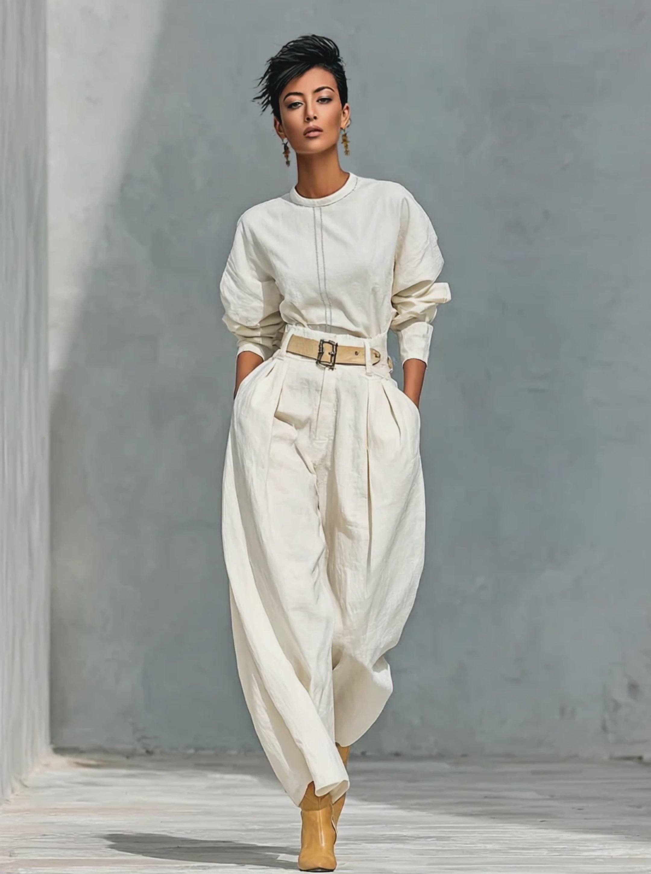 Women's Fashion Cotton And Linen Blend Crew Neck Long Sleeve Shirt Loose Trousers Set (belt Not Included)MDA2555G6Y