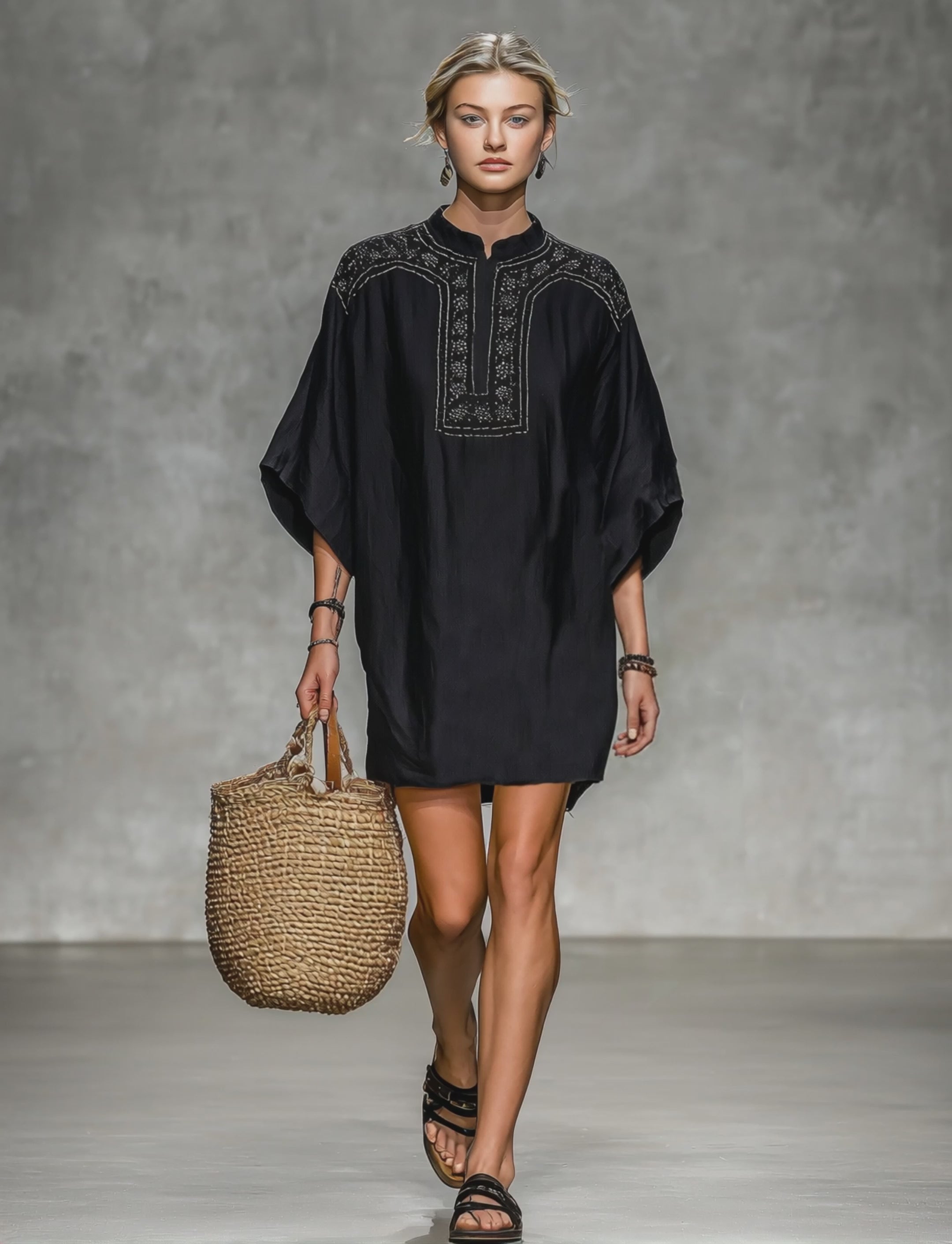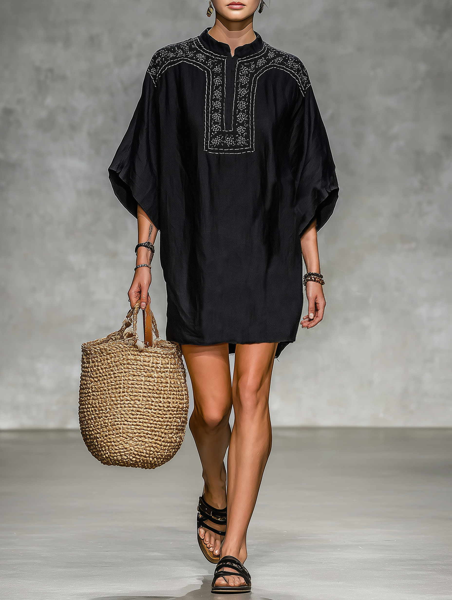 Women's Minimalist Short-sleeved Linen Blend Mini Dress With Embroidered Neckline MDZ2692A7Y