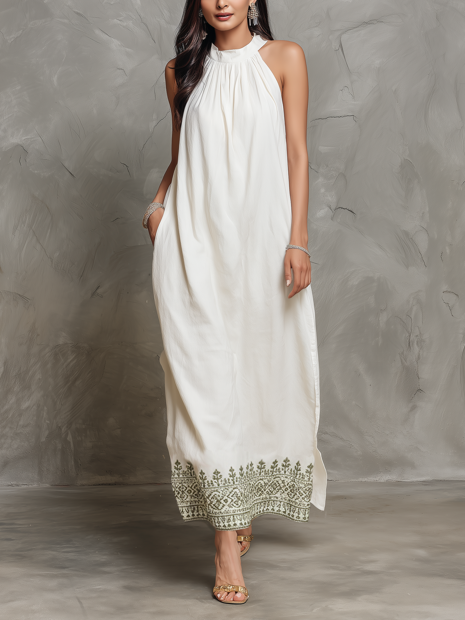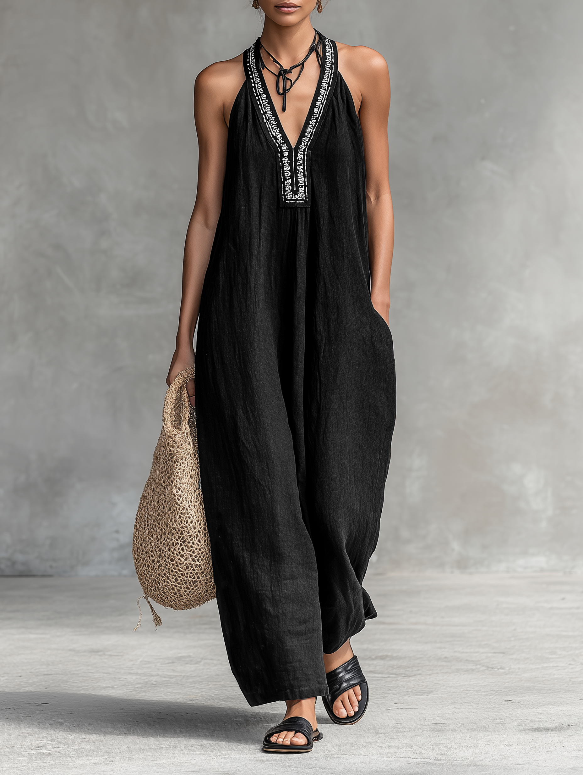 Women's Minimalist V-neck Embroidered Sleeveless Maxi Dress MDZ0682B1Y