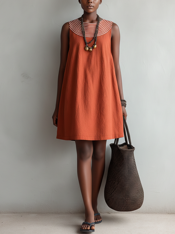 Women's Casual Orange Cotton Linen Round Neck Embroidered Sleeveless Loose Short Dress MDZ2535B5AN