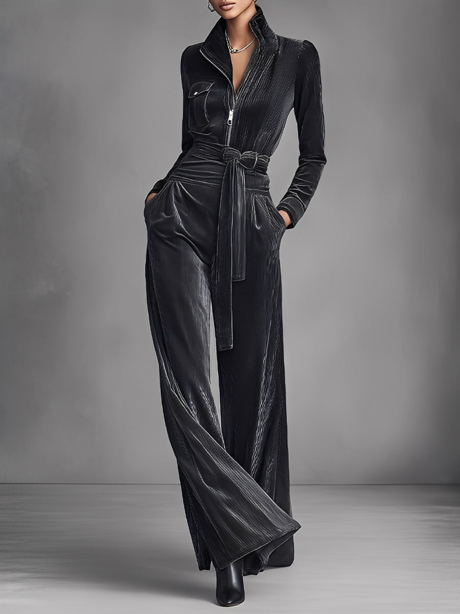 Women's Black Velvet Jumpsuit With Sleek Silhouette & Long Sleeves, Sophisticated Evening-Party Style Jumpsuit MDA2411L8I