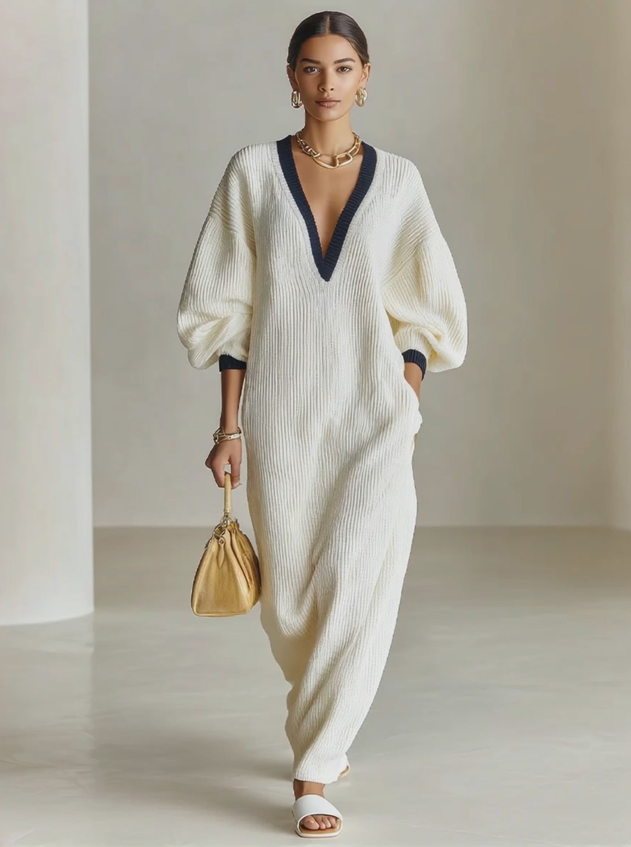 Women’s Cream Elegant Ribbed Knit Contrast V-Neck Balloon-Sleeve Maxi Sweater Dress