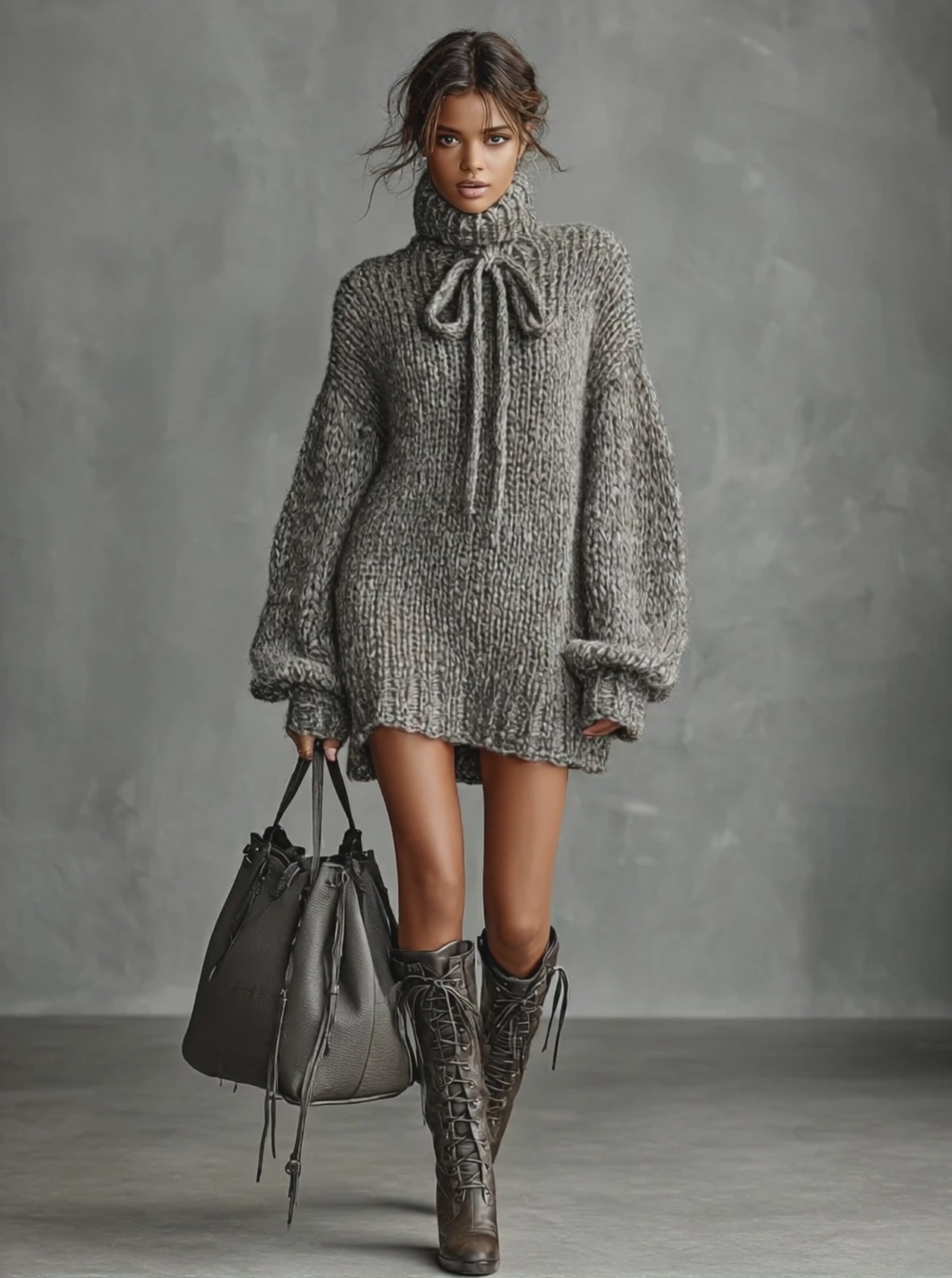 A cozy and stylish mini dress crafted from soft knit fabric, featuring a minimalist design with a high neck and charming bow tie detail. The loose fit ensures all-day comfort and effortless chic for any occasion.