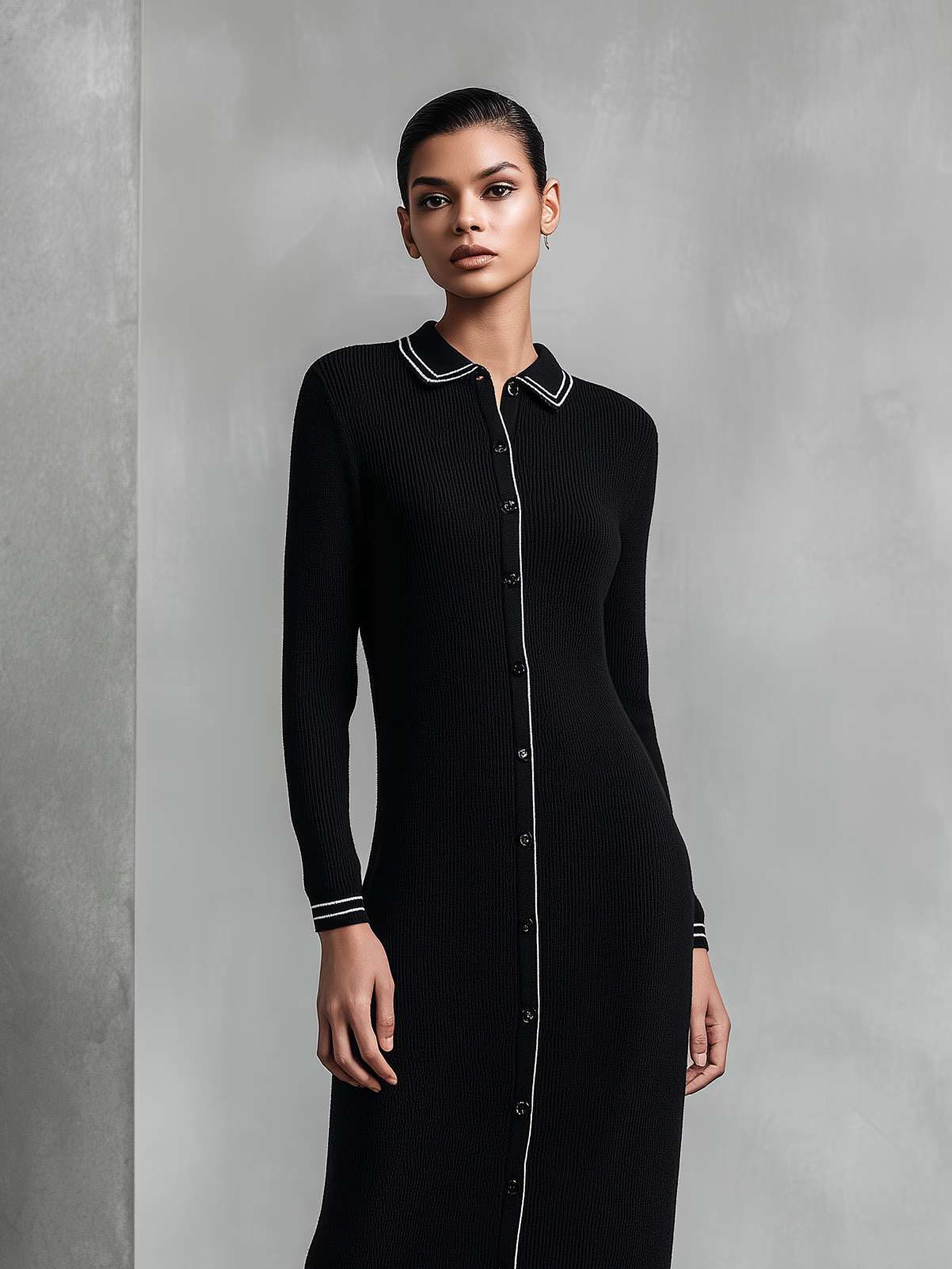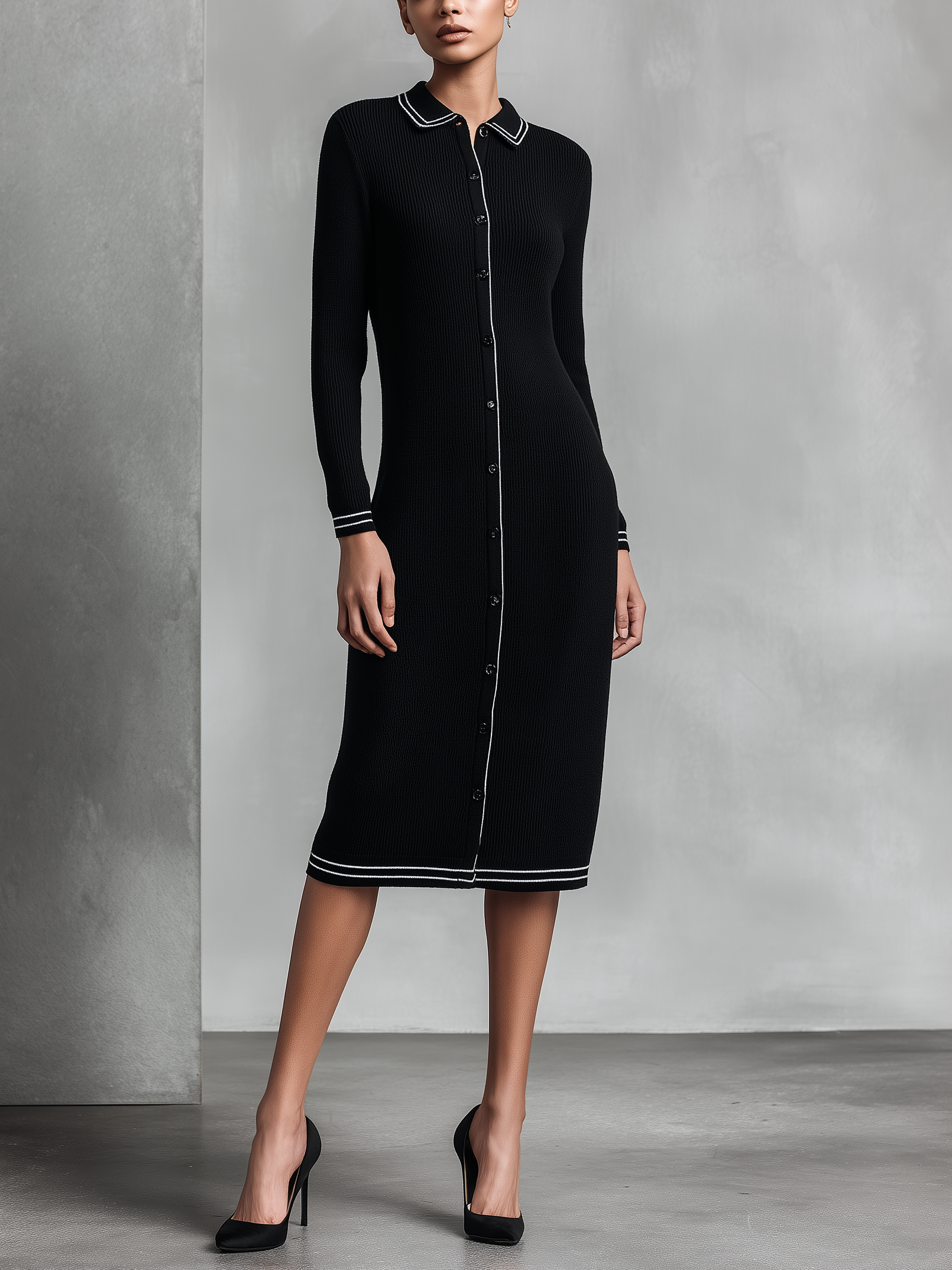 Women's Elegant Black Knitted Thin Long-sleeved Button-front Midi Dress MDZ0762A5AN