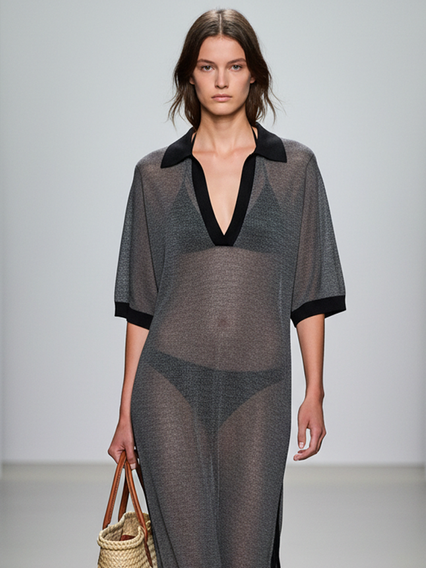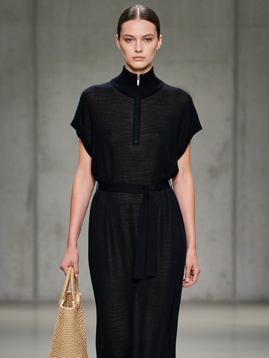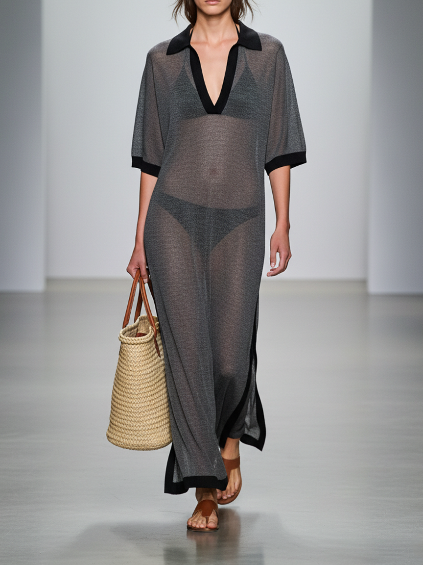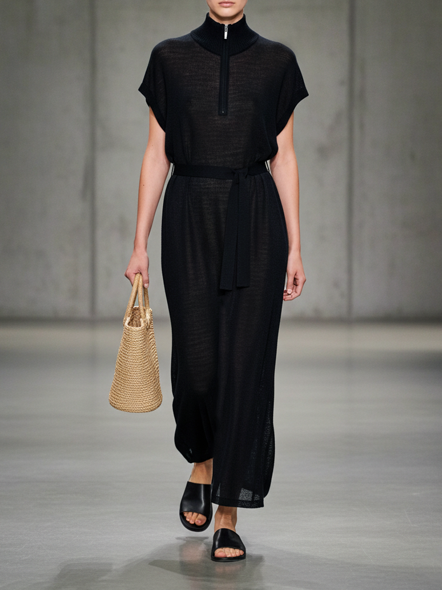 Women's Minimalist Knitted Zipper Collar Short-sleeved Sheer Maxi Dress MDZ0968A9Y
