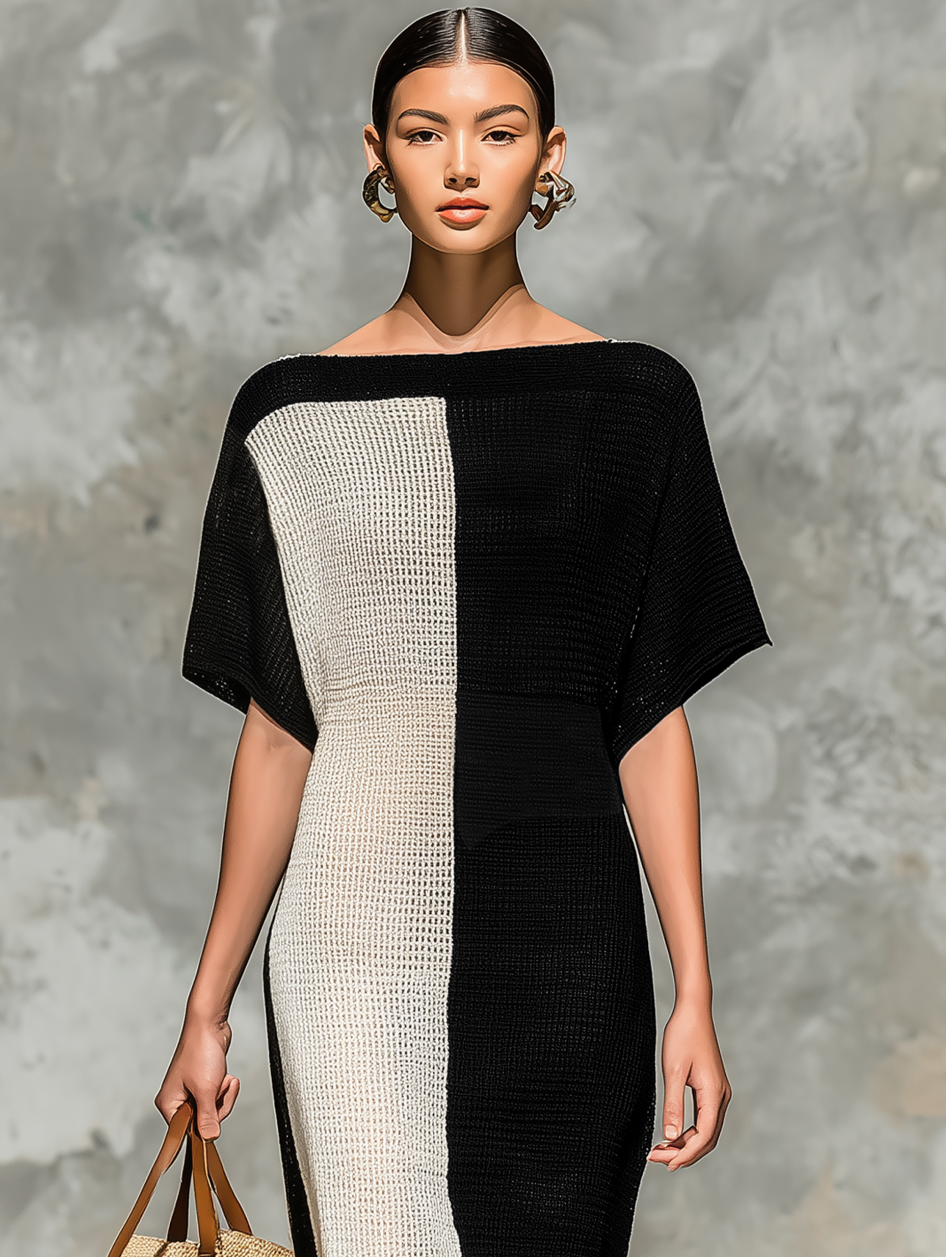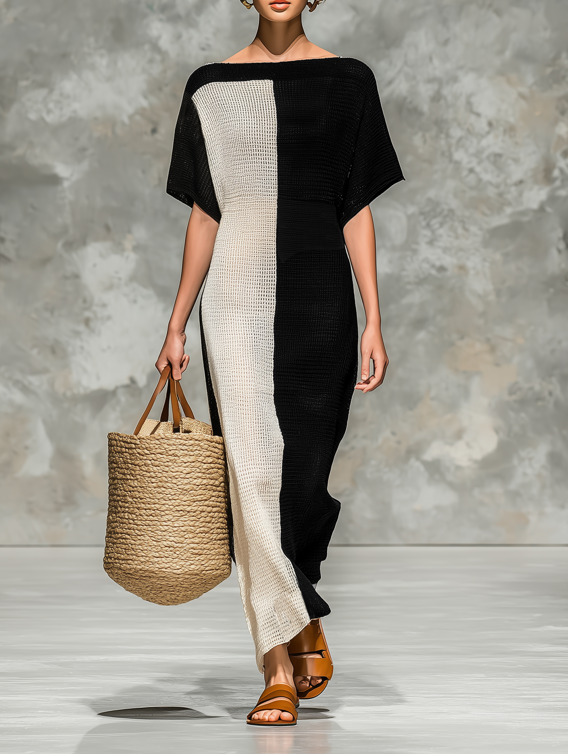 Women's Minimalist Knitted Boat Neck Short-sleeved Maxi Dress MDZ0969A4Y