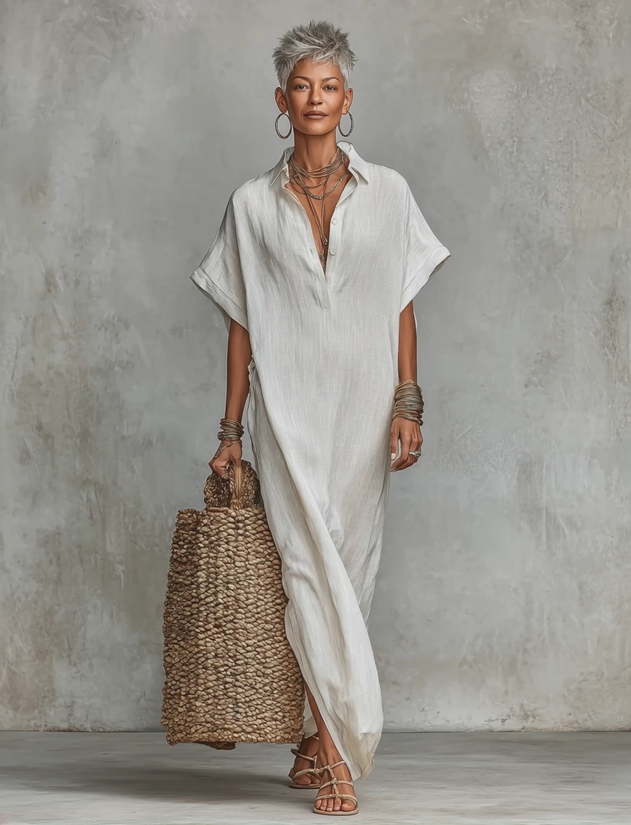 Women's Minimalist Linen Blend Short-sleeved Shirt Maxi Dress MDZ0647A2Y