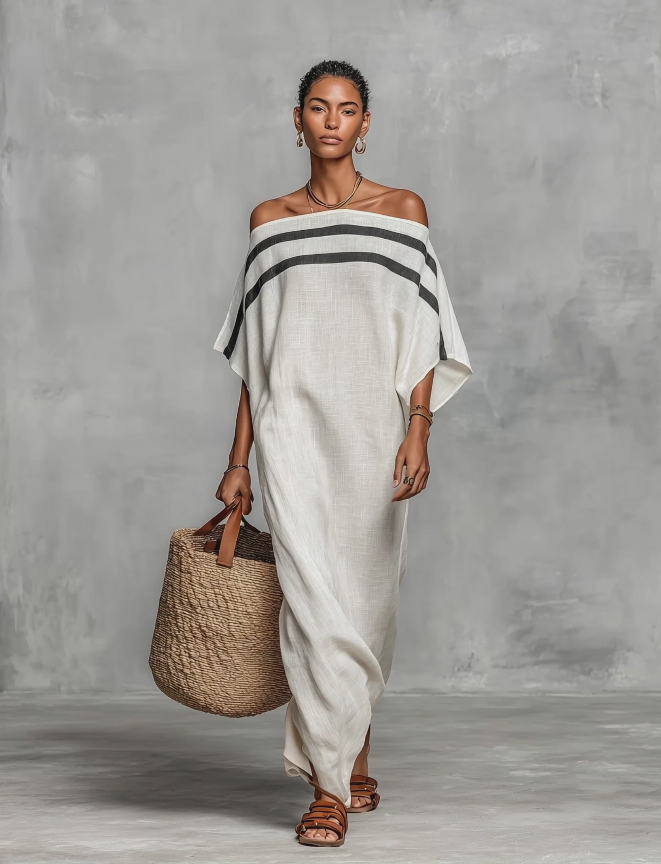 Women's Minimalist Linen Blend Off-the-shoulder Batwing Sleeve Straight-cut Maxi Dress MDZ0949A8Y