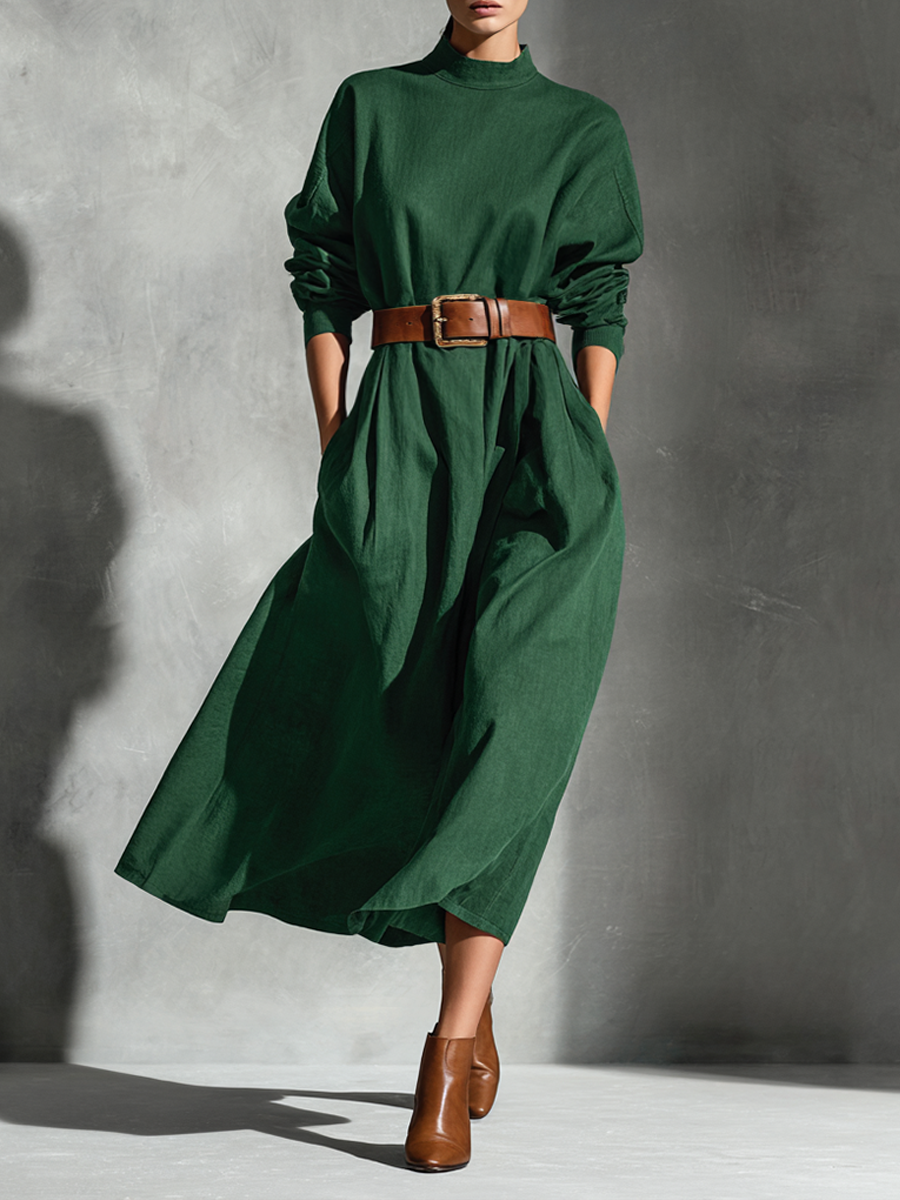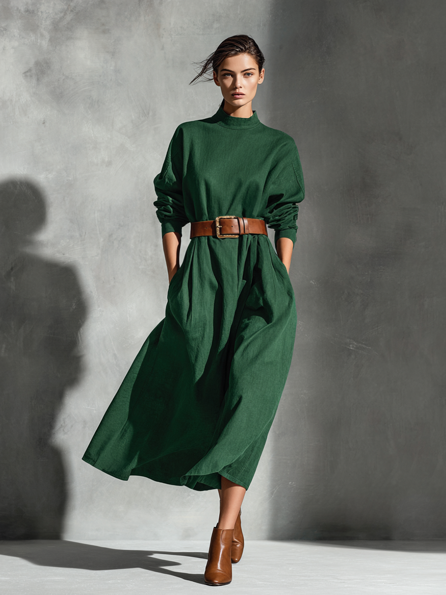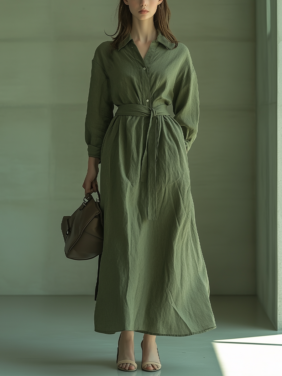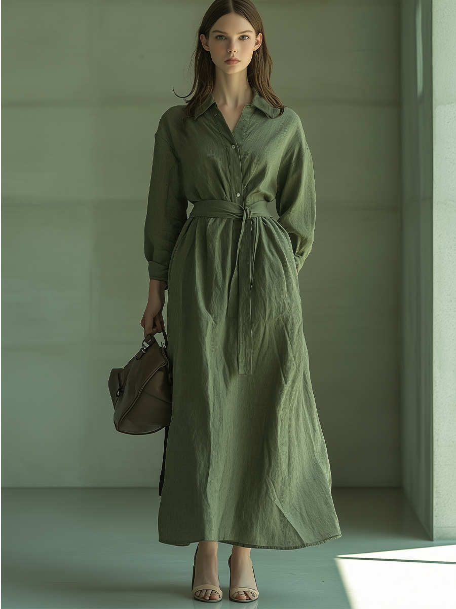 Women's Olive Green Cotton-linen Fabric Lapel Tie Waist-cinching Long Dress MDA2889K7T