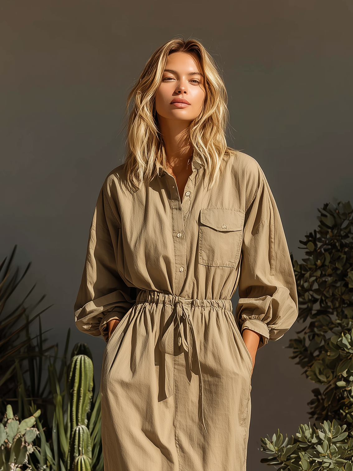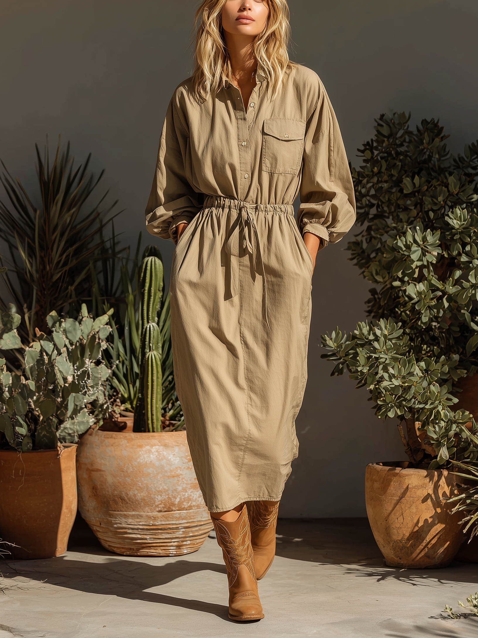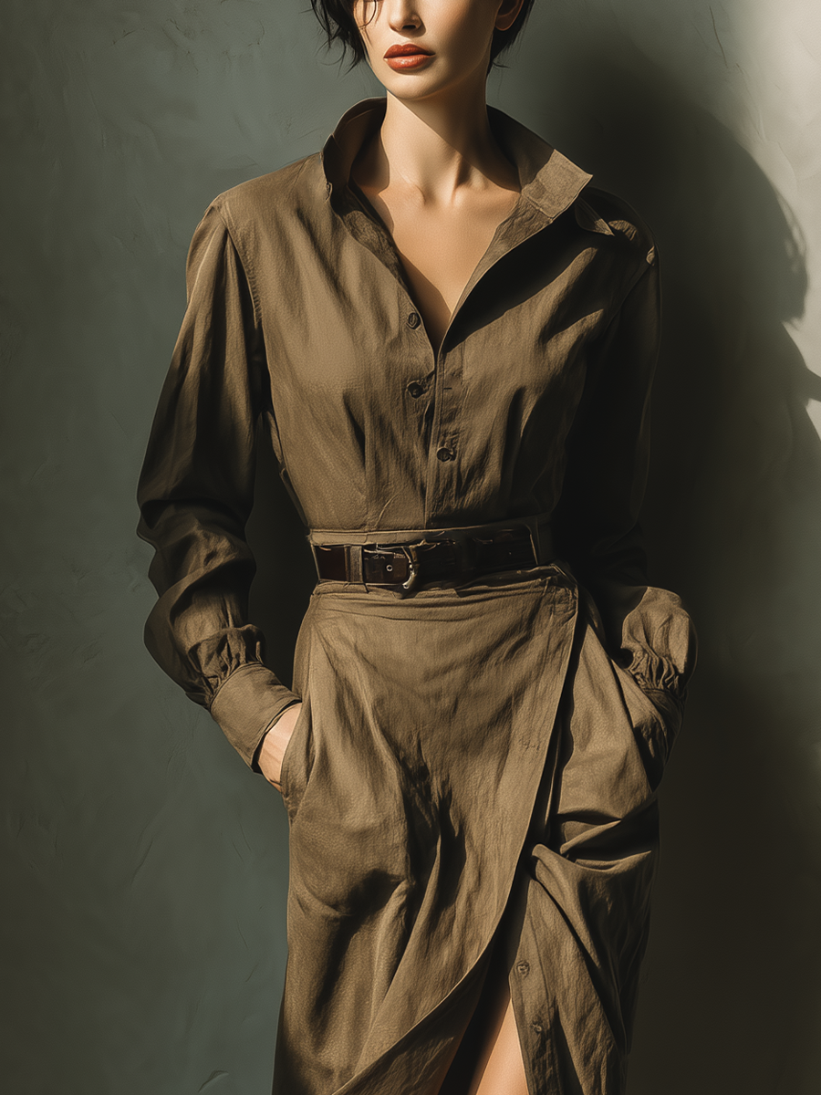 Women's Fashionable, Casual, And Versatile Khaki Midi Dress With Gathered Waist And Shirt Collar, Long Sleeves MDA2694K7AN