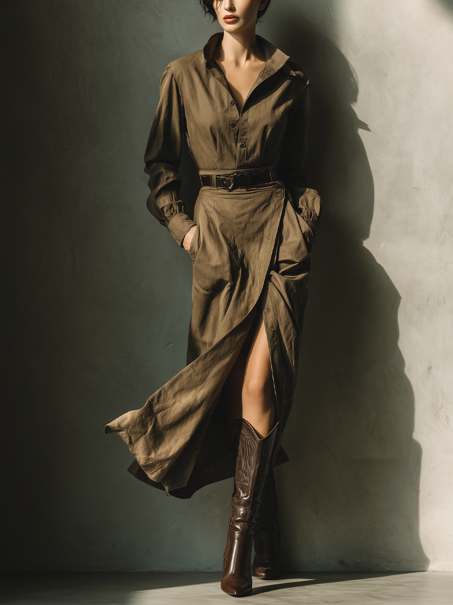 Women's Khaki Brown Cotton Linen Dress With A Lapel Collar, Fitted Waist, And Slit MDA2934K3T