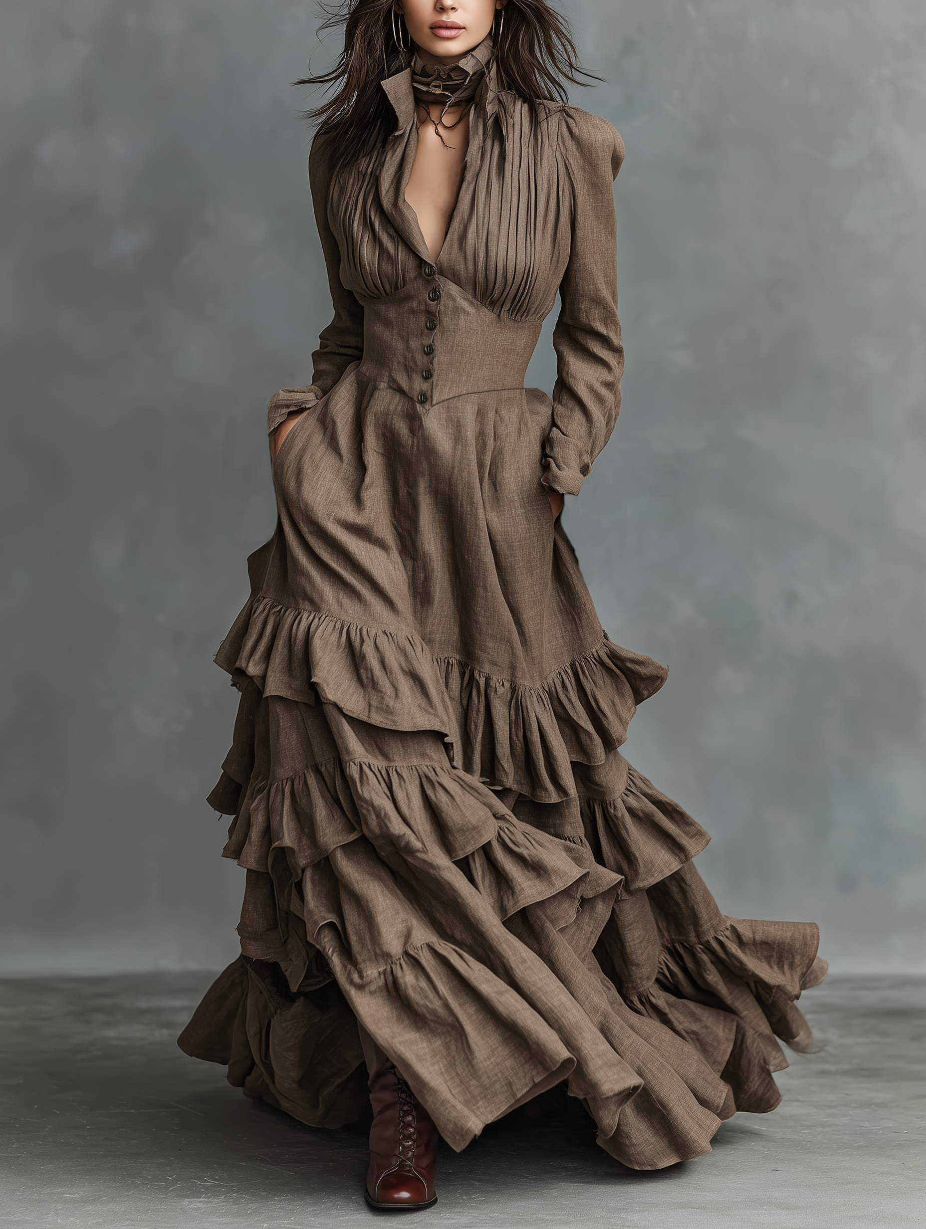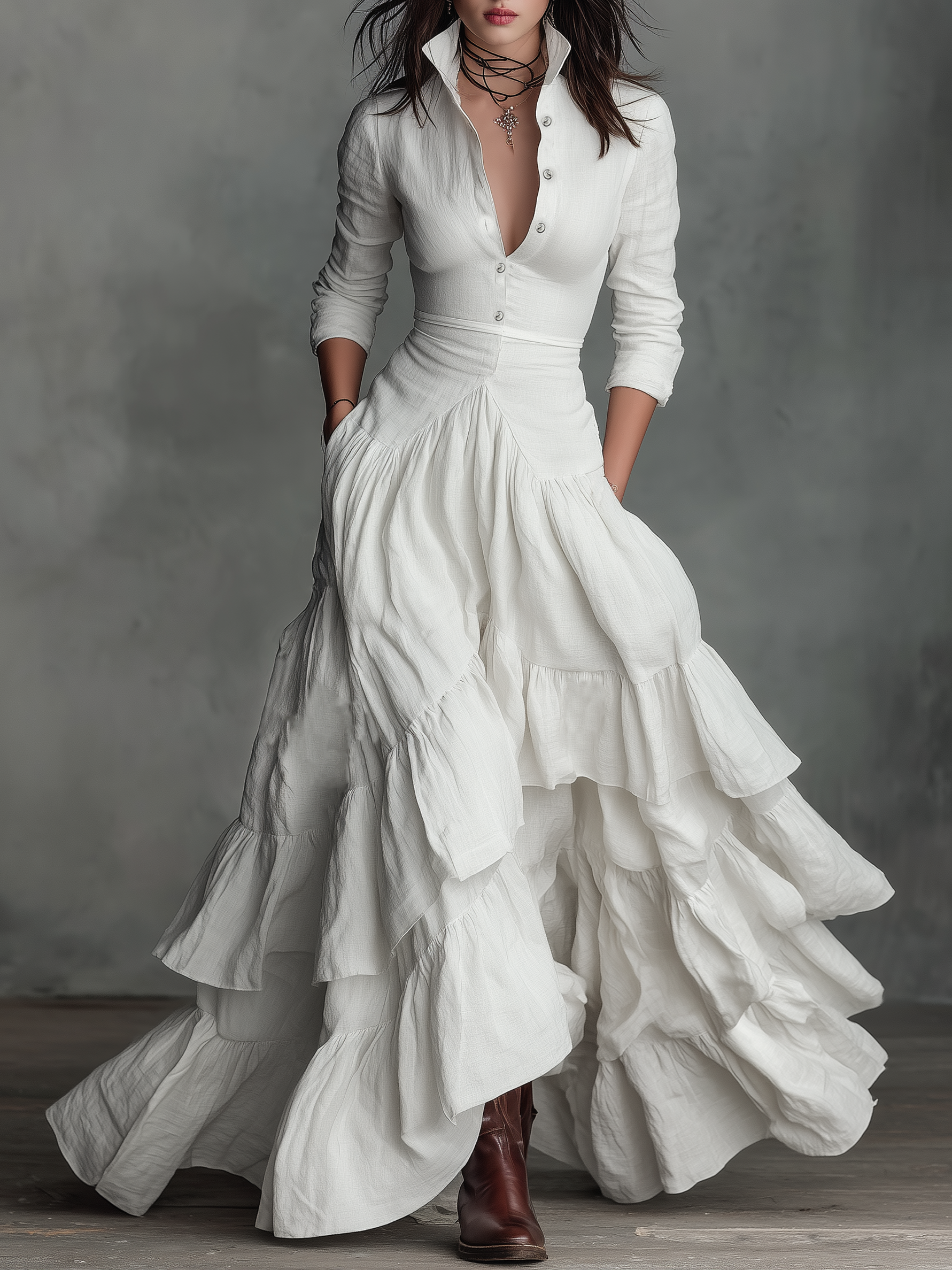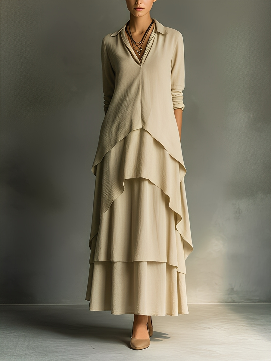 Women's Cotton And Linen Blend Shirt Collar Multi-layered Ruffle Maxi Dress MDA2234K2Y