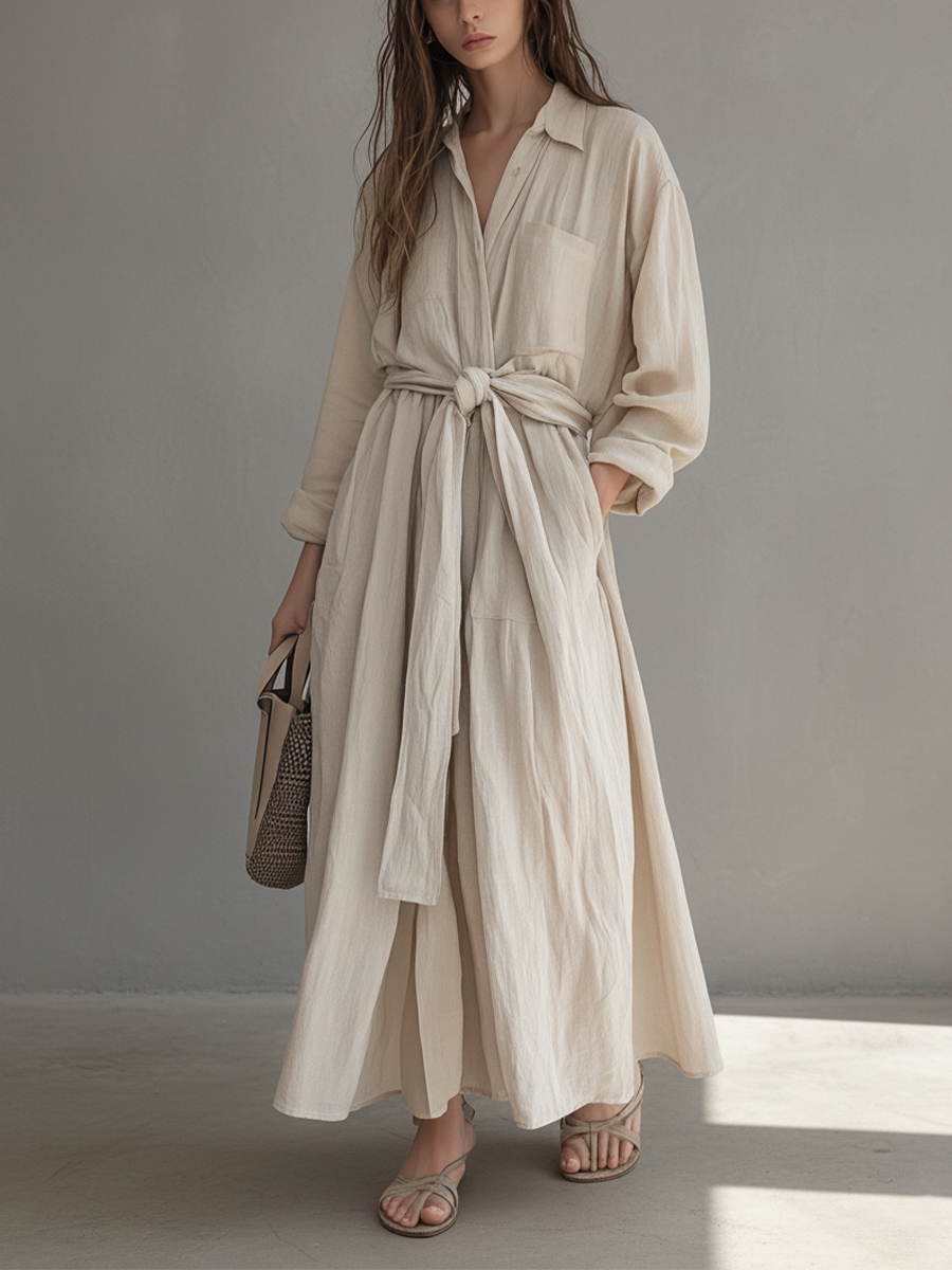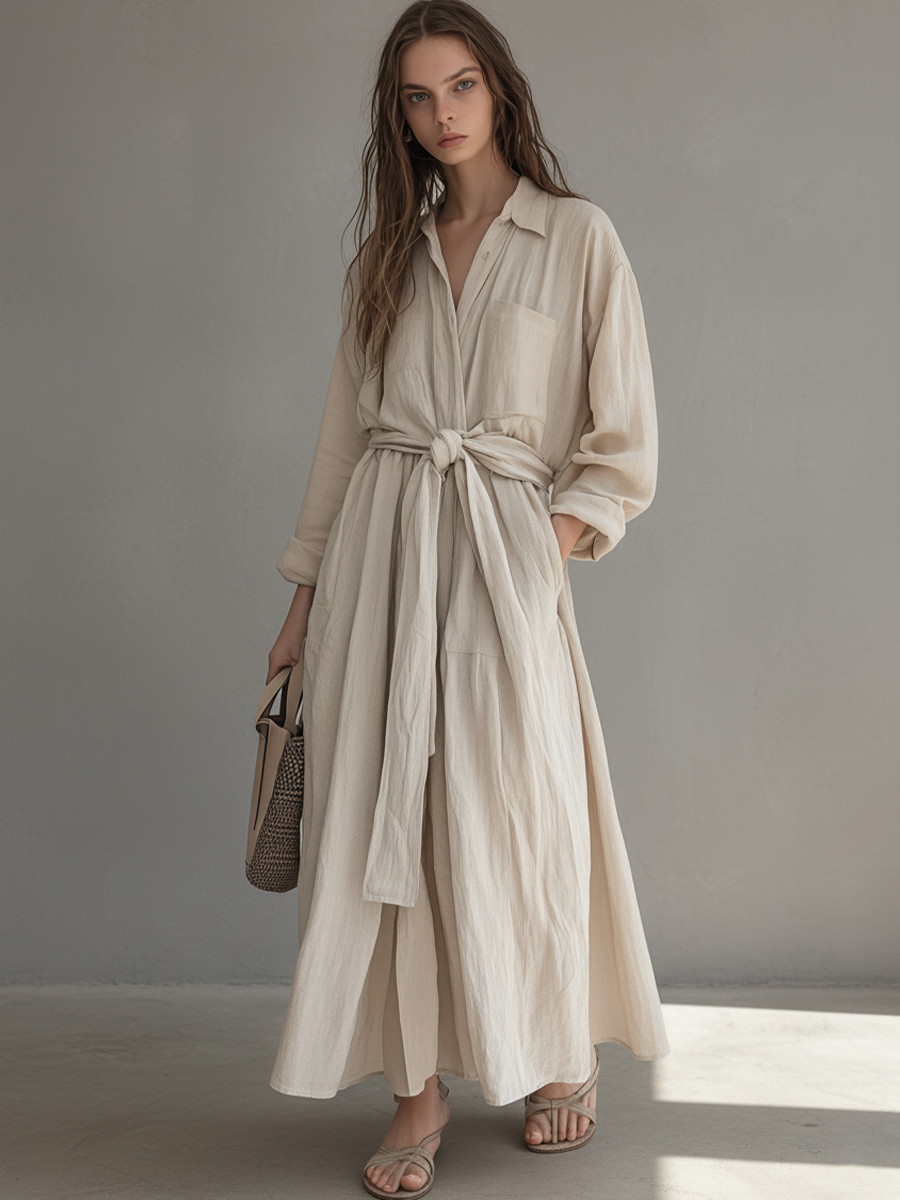 Women's Beige Linen Shirt Collar Long-Sleeve Dress MDA2904K1AP