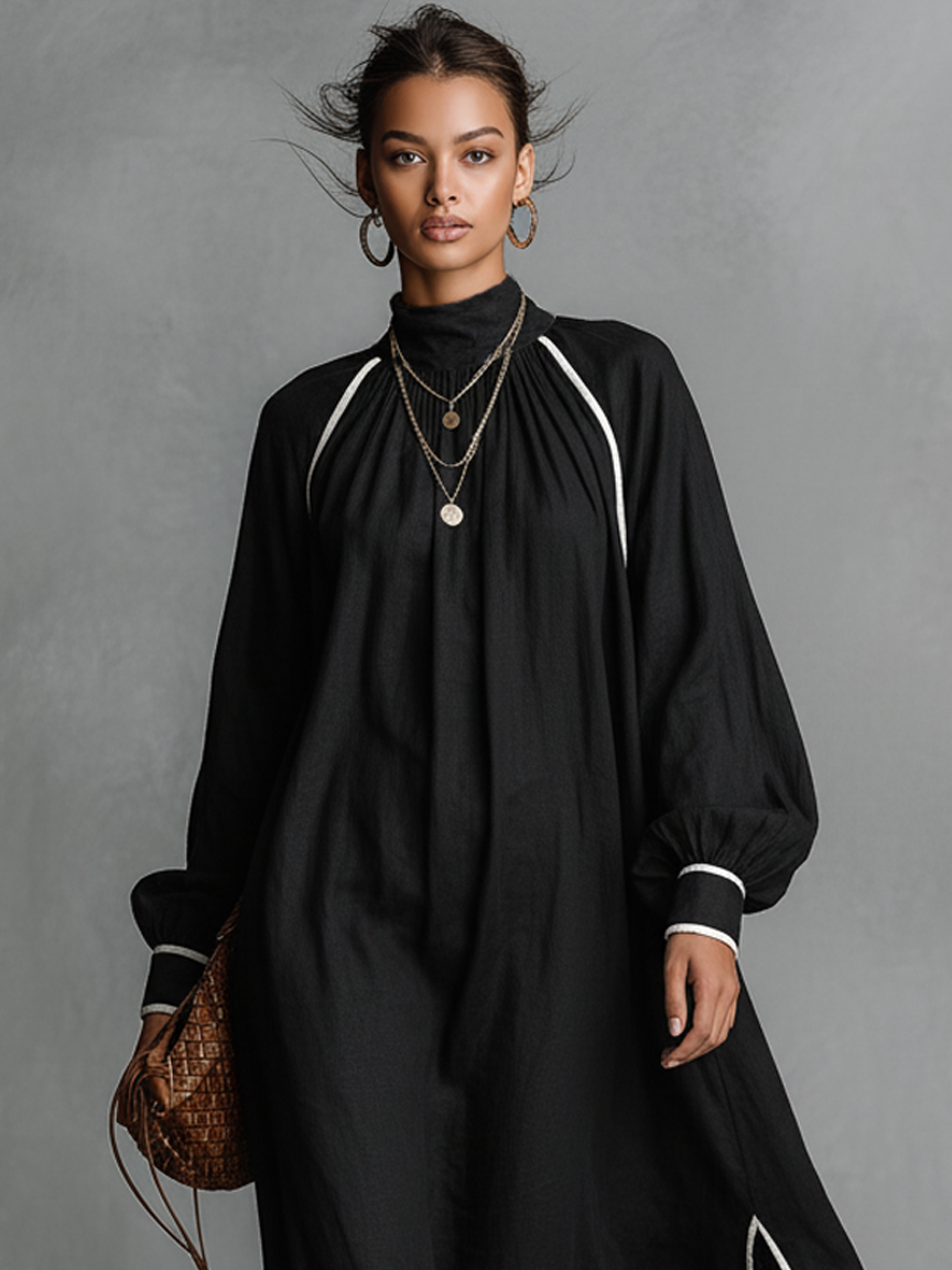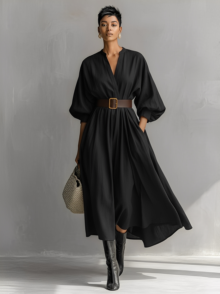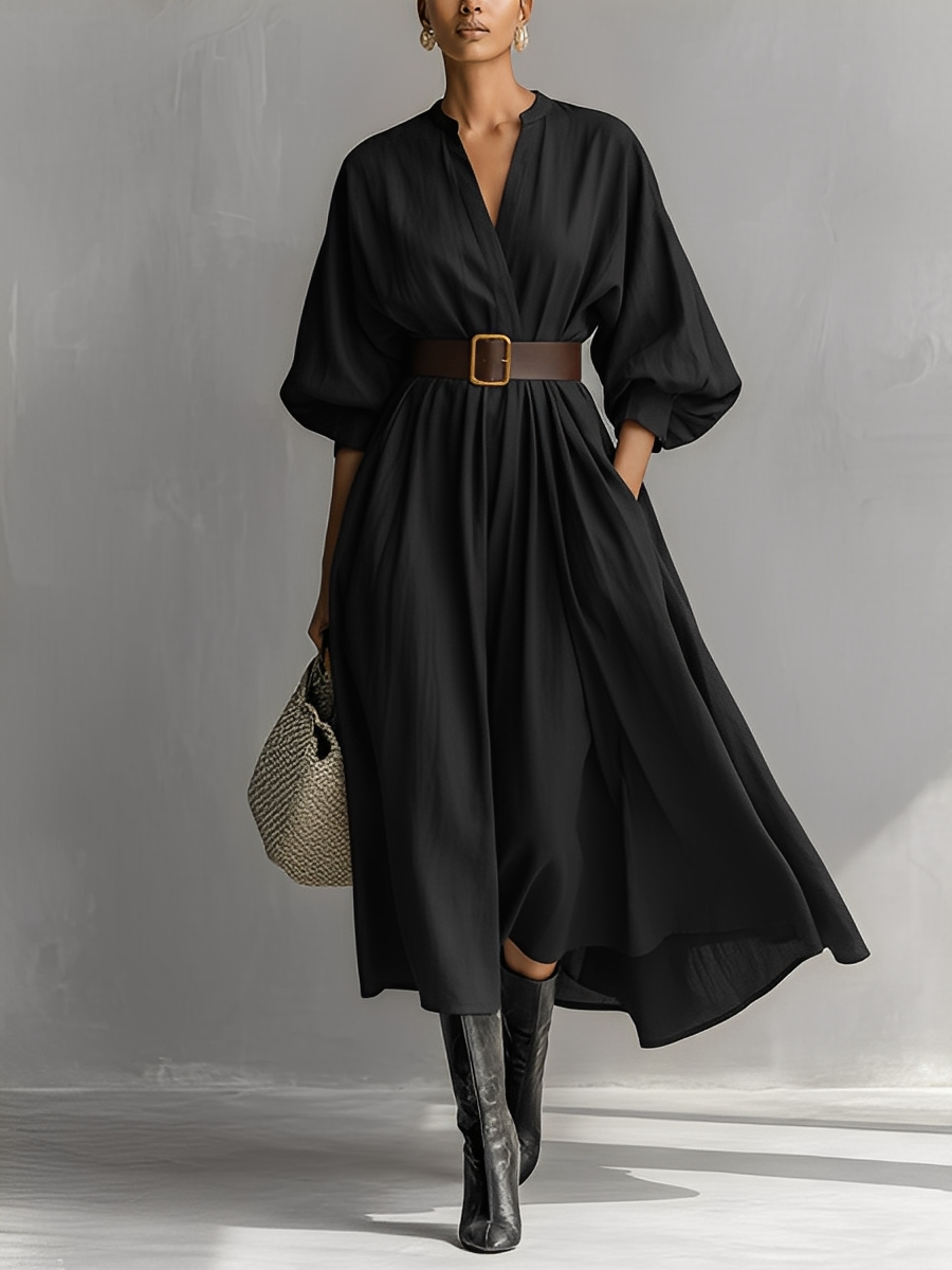 Women's Black Cotton Linen Slim-Fit V-Neck Lantern Sleeve Long Dress MDA2884K6T
