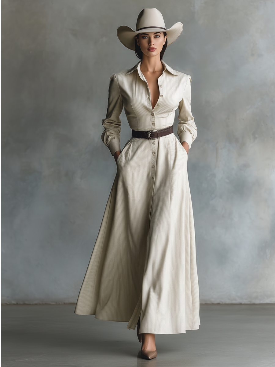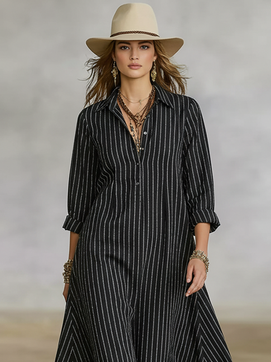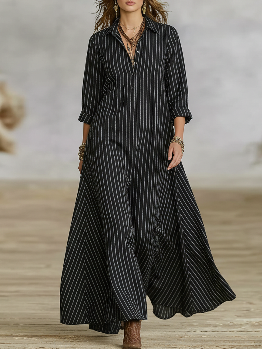 Women's Loose-fitting Cotton-linen Blend Striped Button-down Collar Long-sleeved Maxi Dress MDA1424K0Y