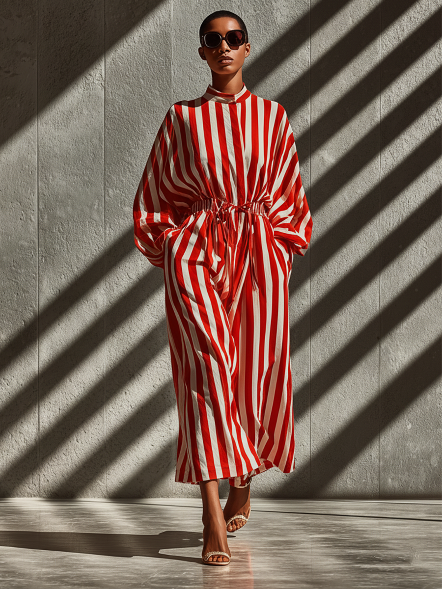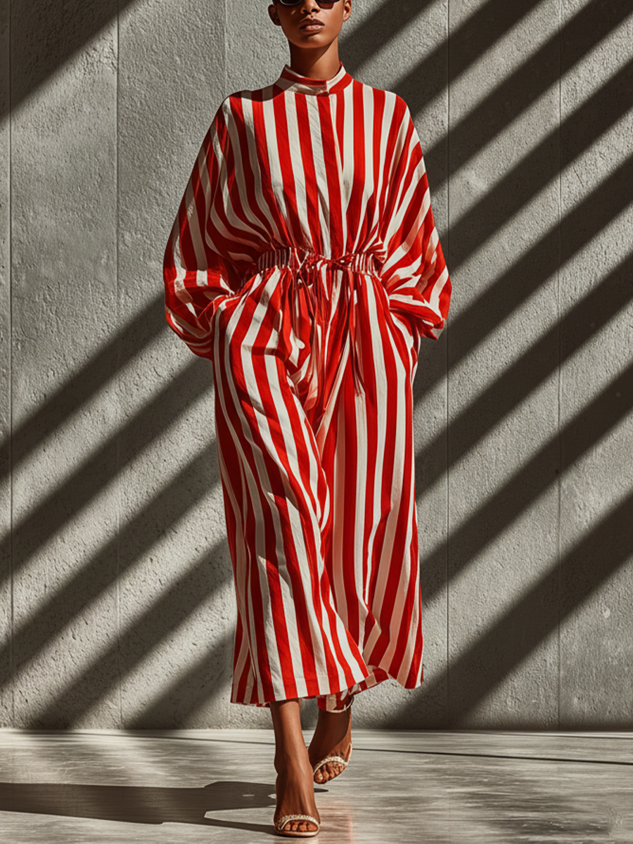 Women's Red And White Striped Cotton Fitted Loose Dress MDA2844K0T