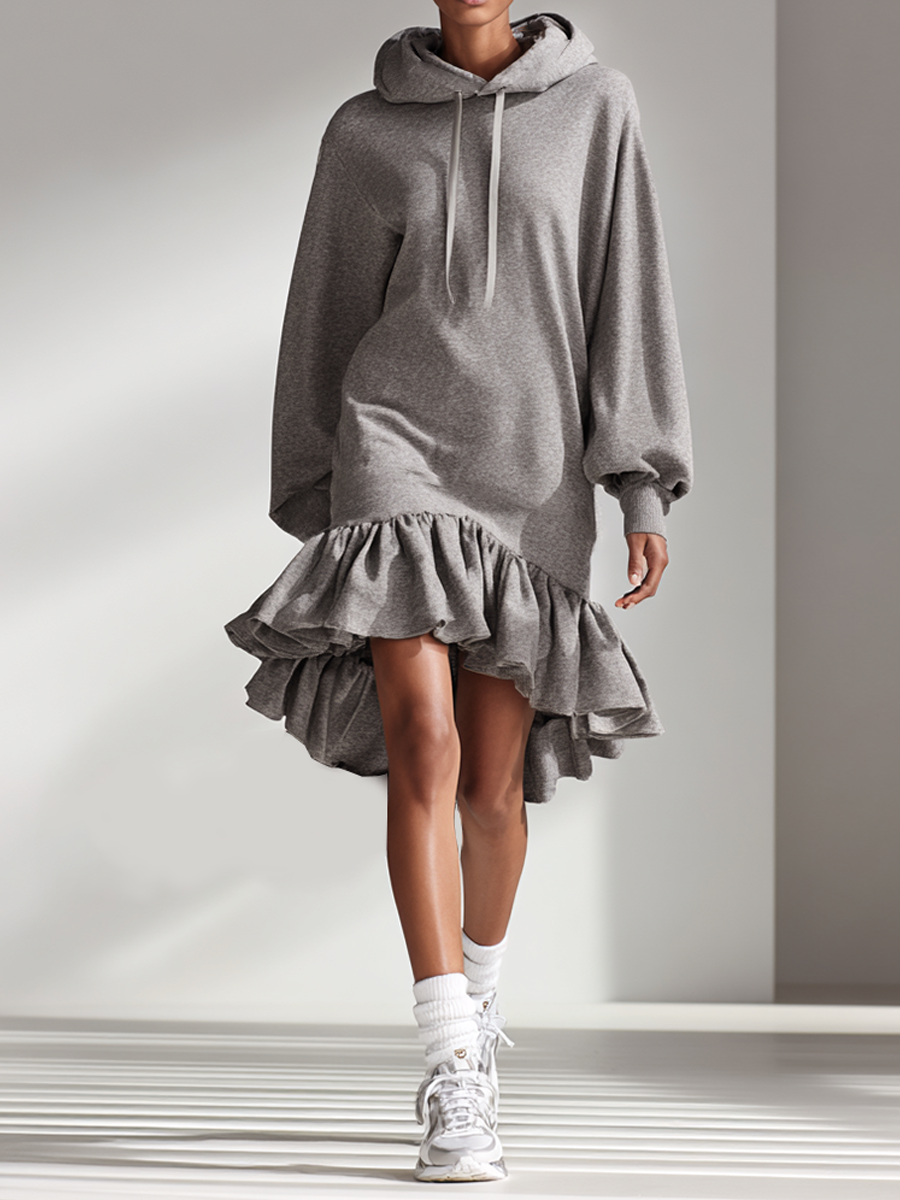 Women's Oversized Hooded Ruffled Hem Sweatshirt Dress MDA2858K2AP
