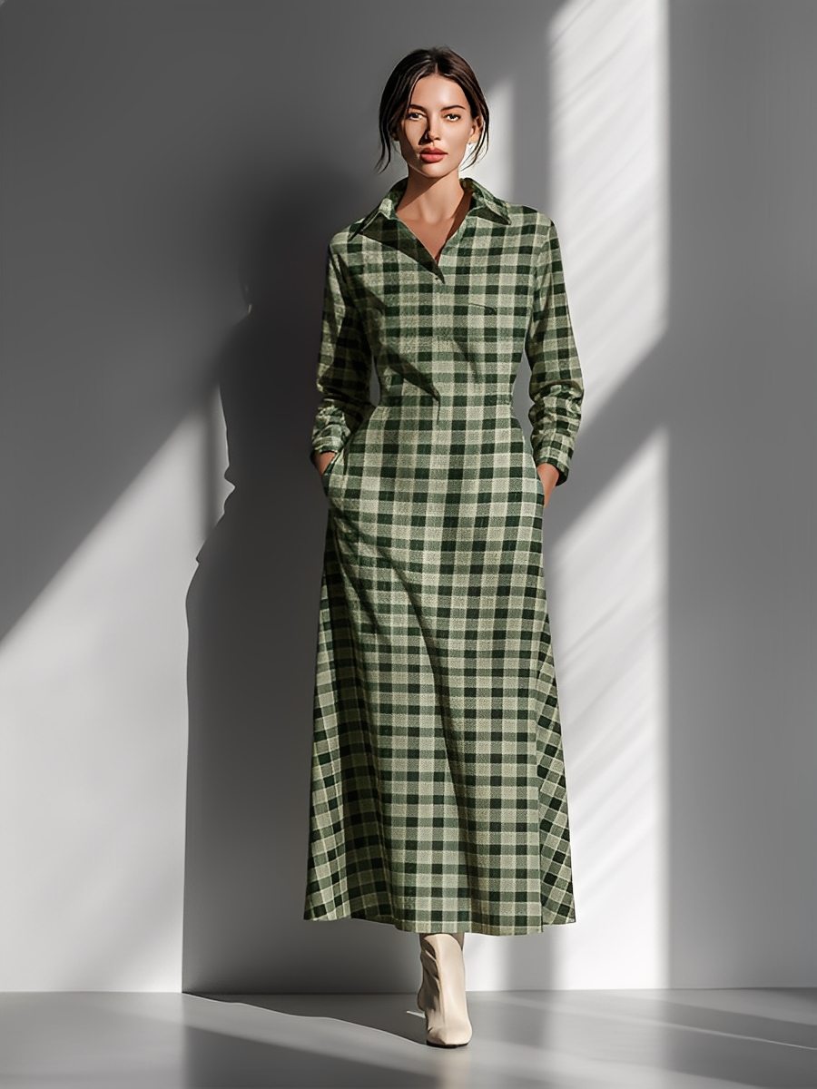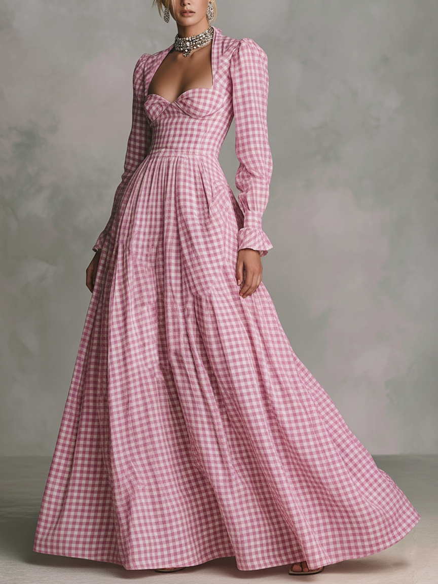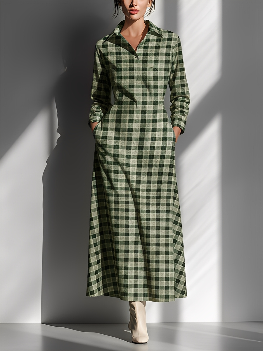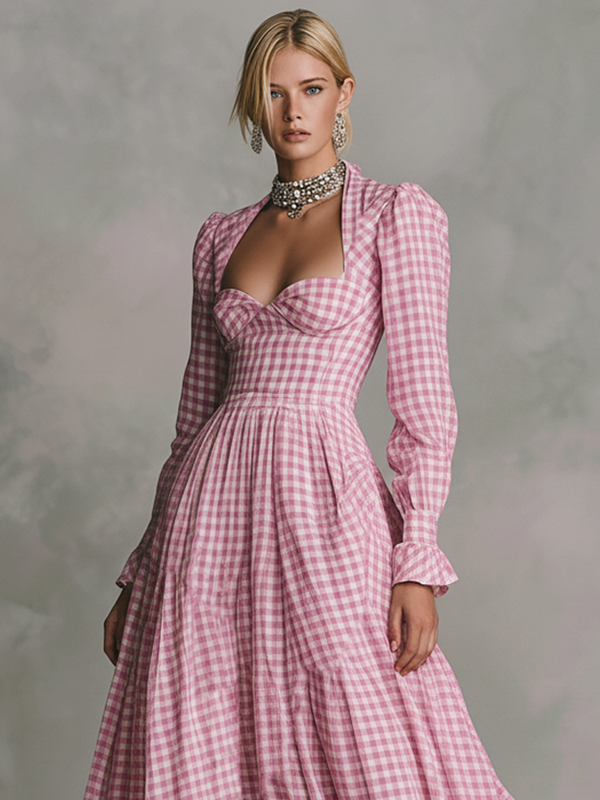 Women's Minimalist Checkered Square-neck Long-sleeved Maxi Dress MDA2747K9Y