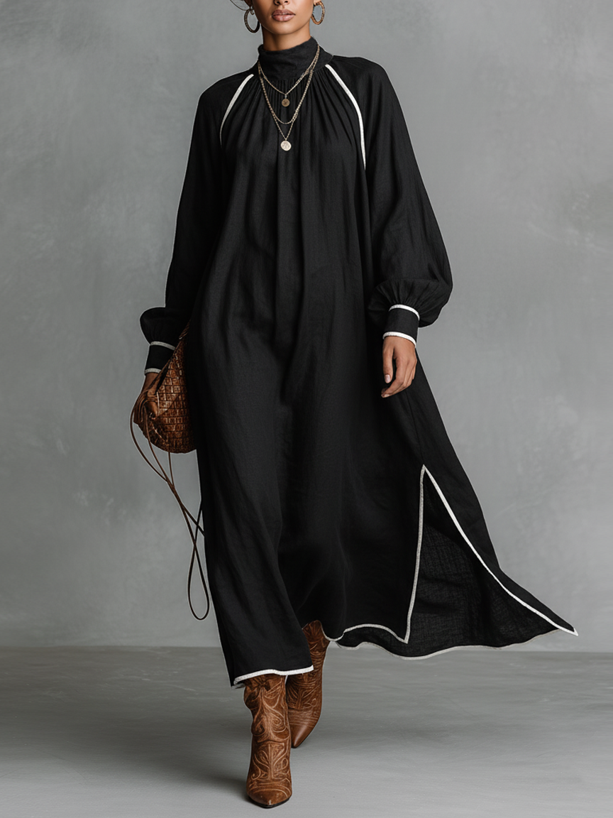 Women's Minimalist Loose-fitting Cotton And Linen White Trim Slits Maxi Dress MDA2221K9Y