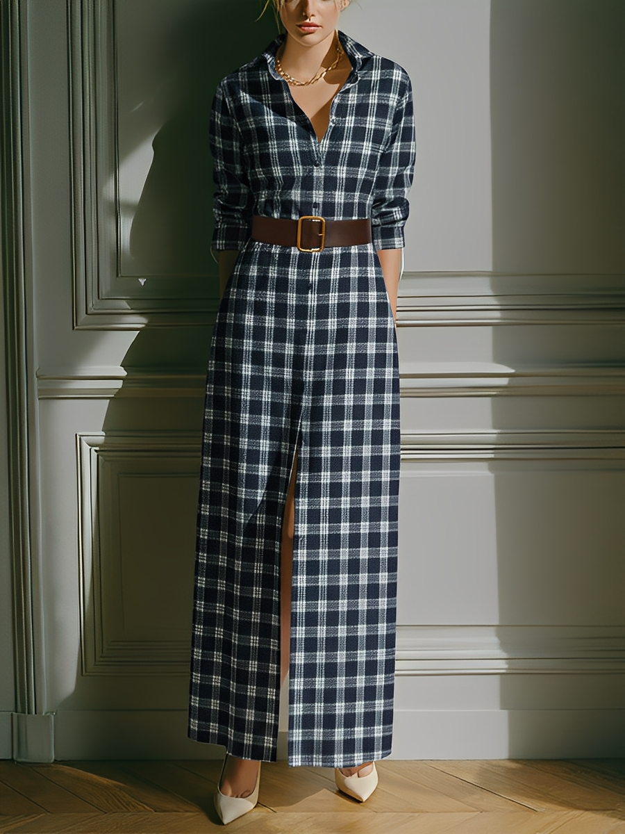 Women's Navy Blue And White Checkered Cotton Linen Lapel Slit Long Dress MDA2800K1T