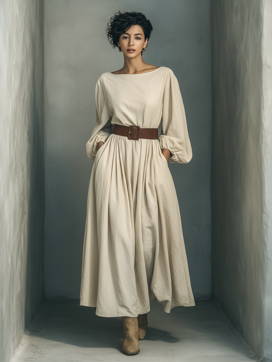 Women's Off-white Cotton Linen Puff Sleeve Fitted Waist Long Dress MDA3034K5T