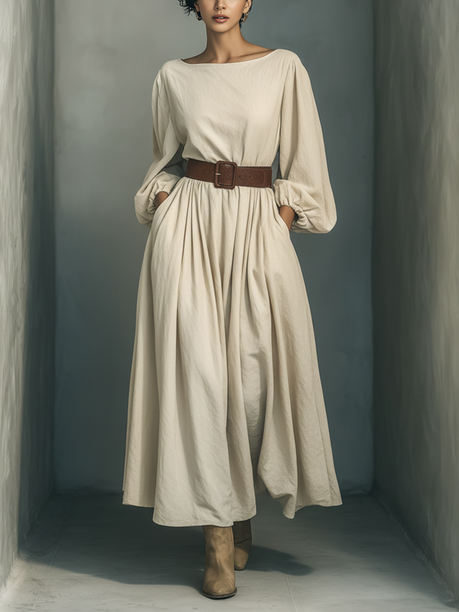 Women's Off-white Cotton-linen Blend Loose-fitting Waist-cinching Long Dress MDA2878K0T