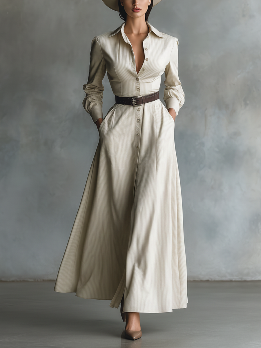 Women's Off-white Striped Cotton Blend Lapel Fitted Waist Full Skirt Long Dress MDA2961K9T