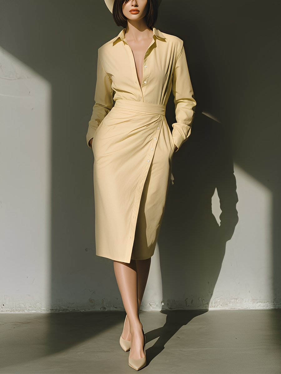 Women's Light Yellow Cotton Midi Dress With A Lapel Collar And Tie Waist MDA2901K6T