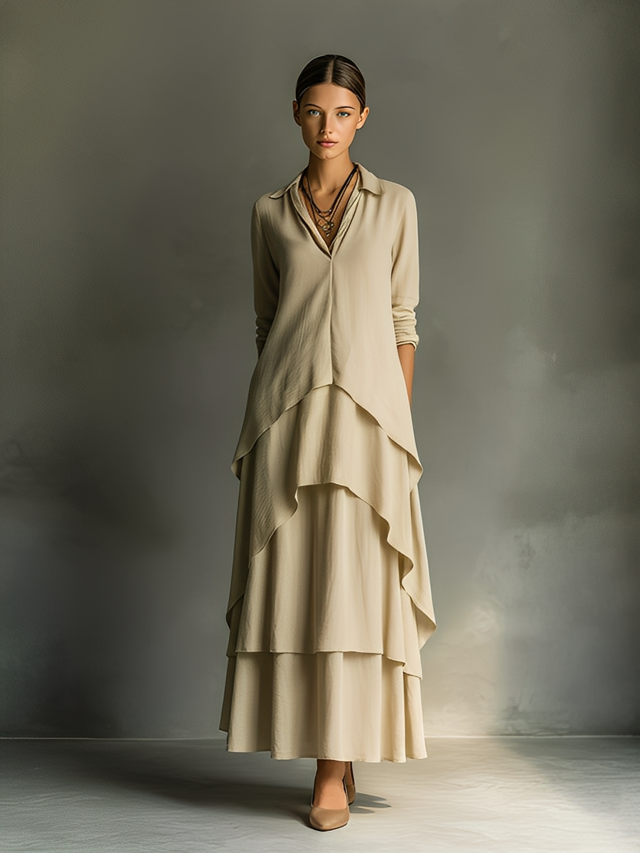 Women's Light Khaki Cotton-linen Blend Layered Long Dress MDA2599K1T