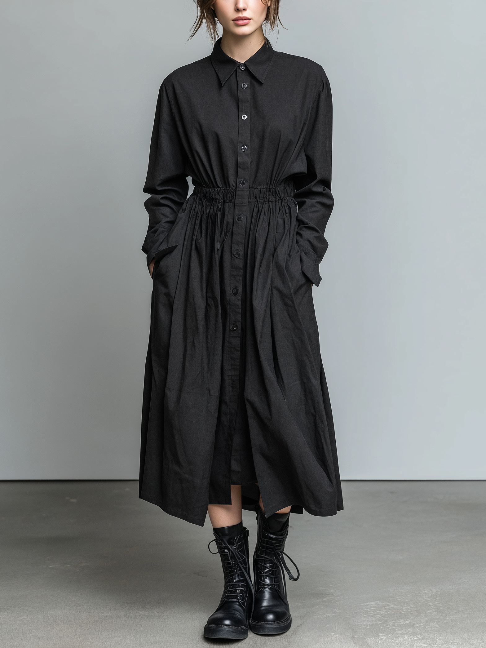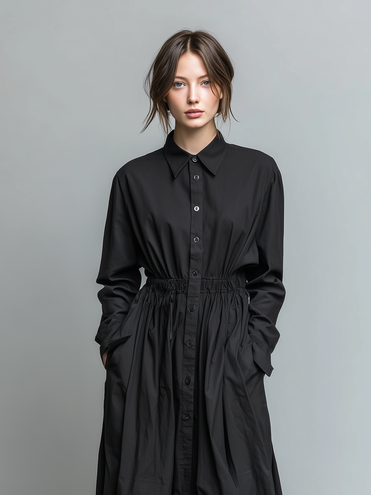 Women's Elegant Black Woven Shirt Collar Long-sleeved Midi Dress MDA2281L0AN
