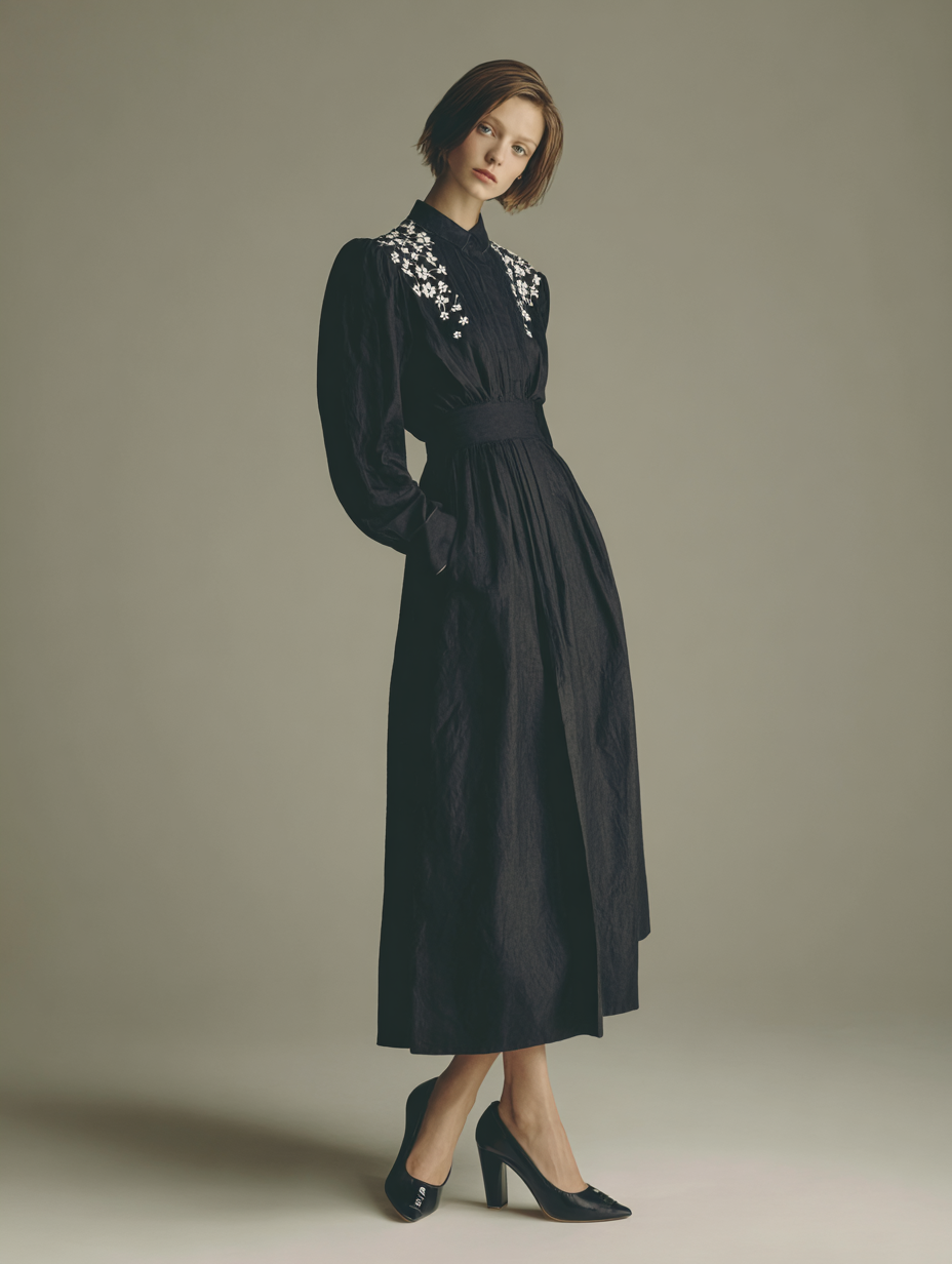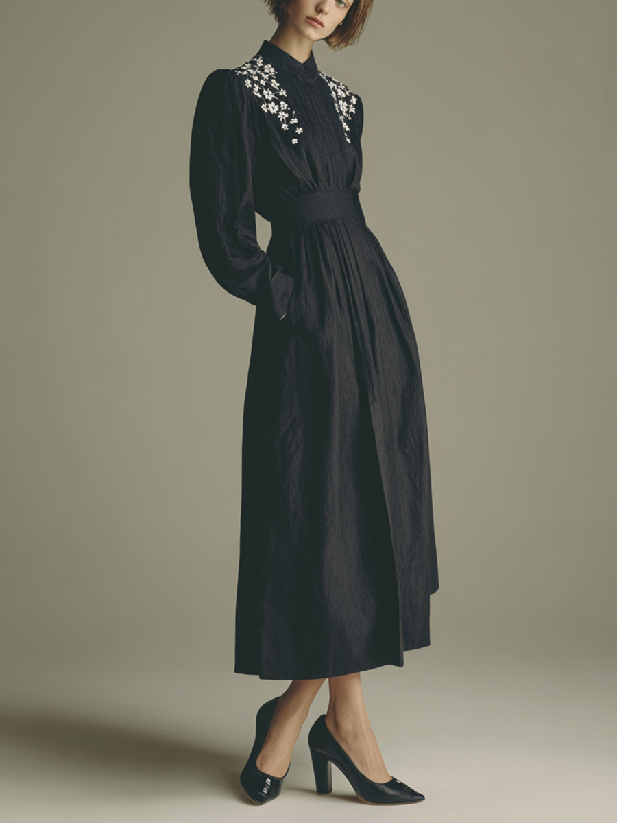 Women's Elegant Navy Blue Cotton And Linen Embroidered Long-sleeved Dress MDA2237L6BA