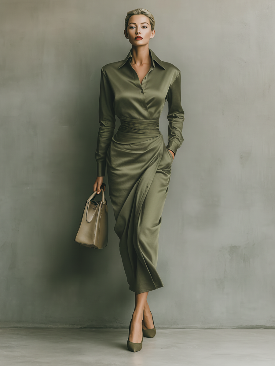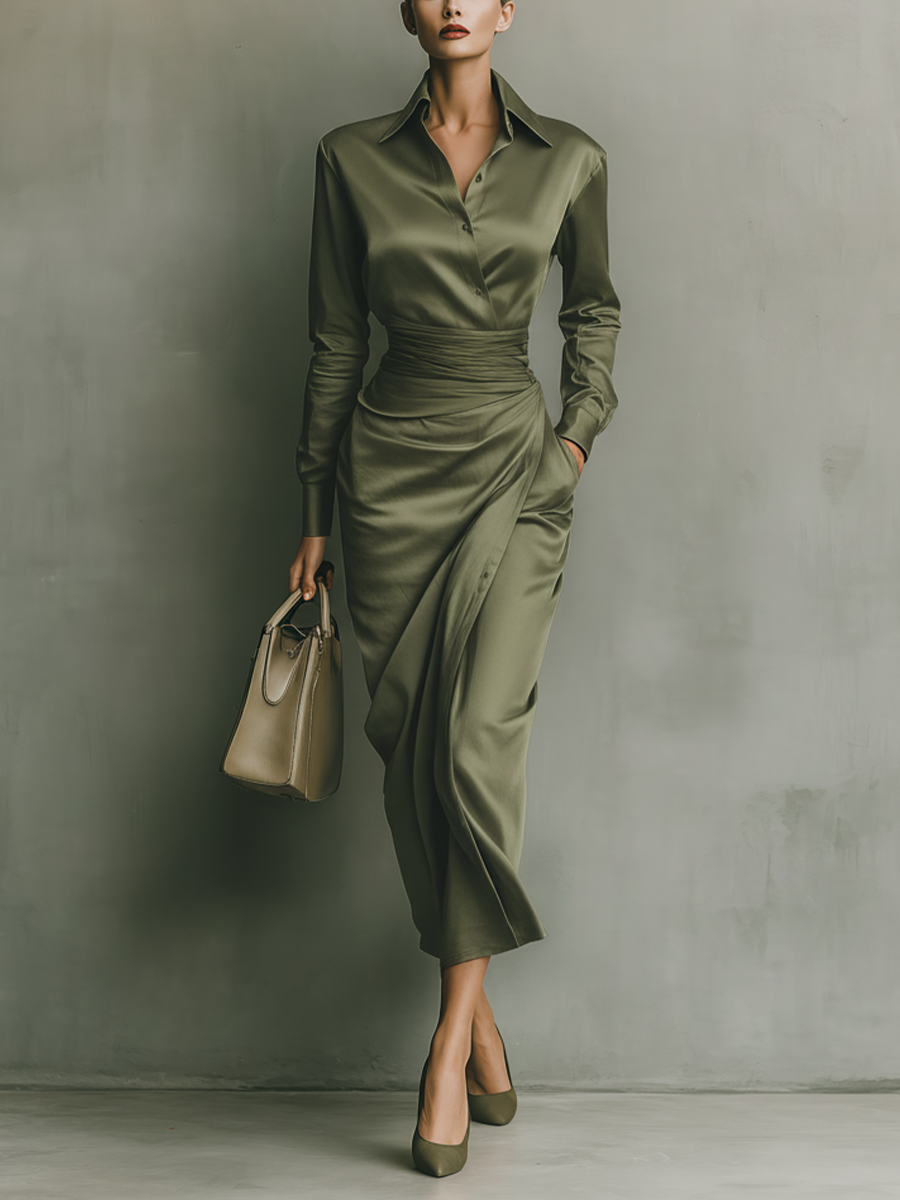 Women's Elegant Khaki Satin Shirt Collar Long-sleeved Midi Dress MDA1297L0AN