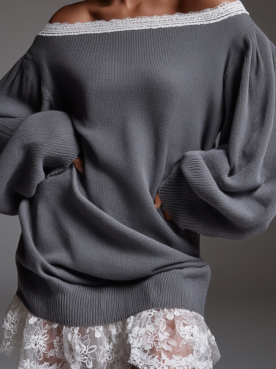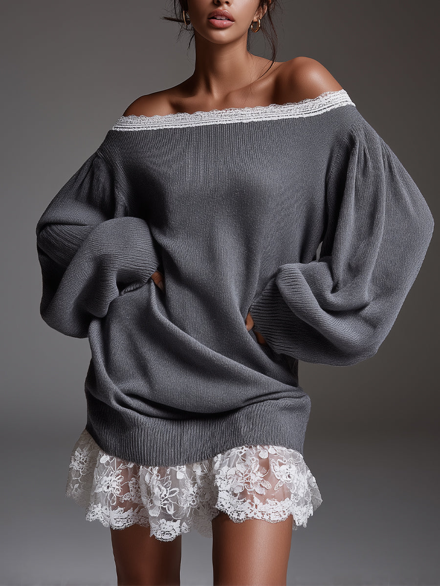 Women's Gray Knitted Romantic-Chic Sweater Dress With Off-Shoulder Lace Trim & Puff Sleeves Mini Dress MDA2276J3I