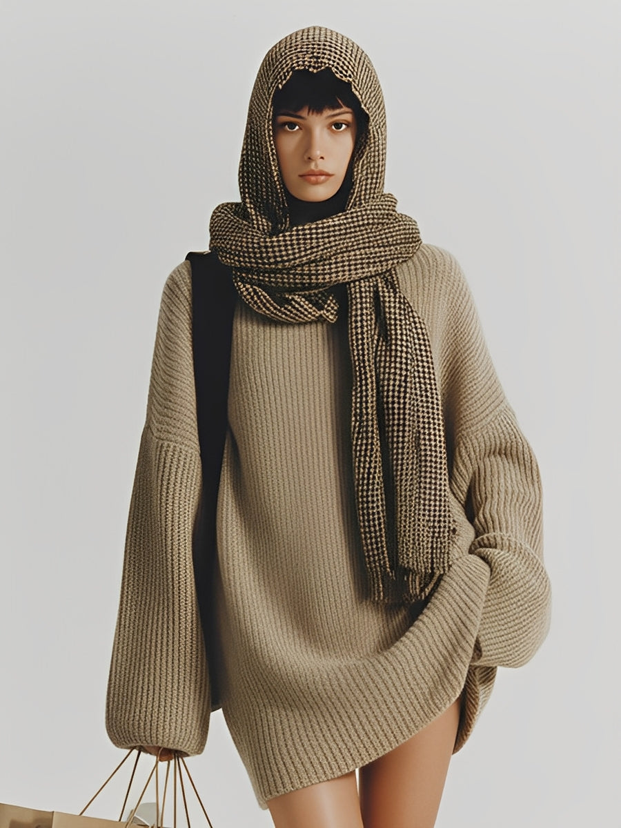 Women's Beige Knit Oversized Slouchy Hem Sweater Dress With Houndstooth Scarf MDA3169J2I