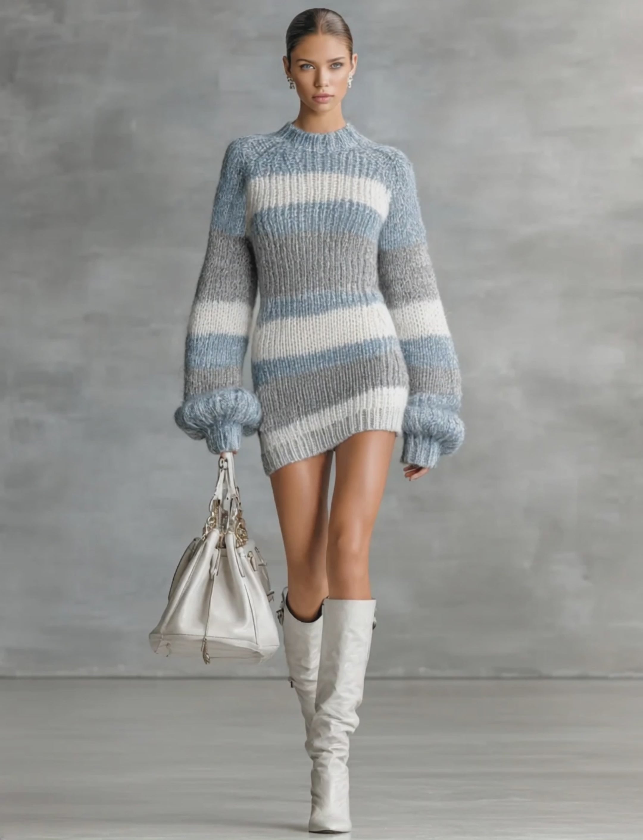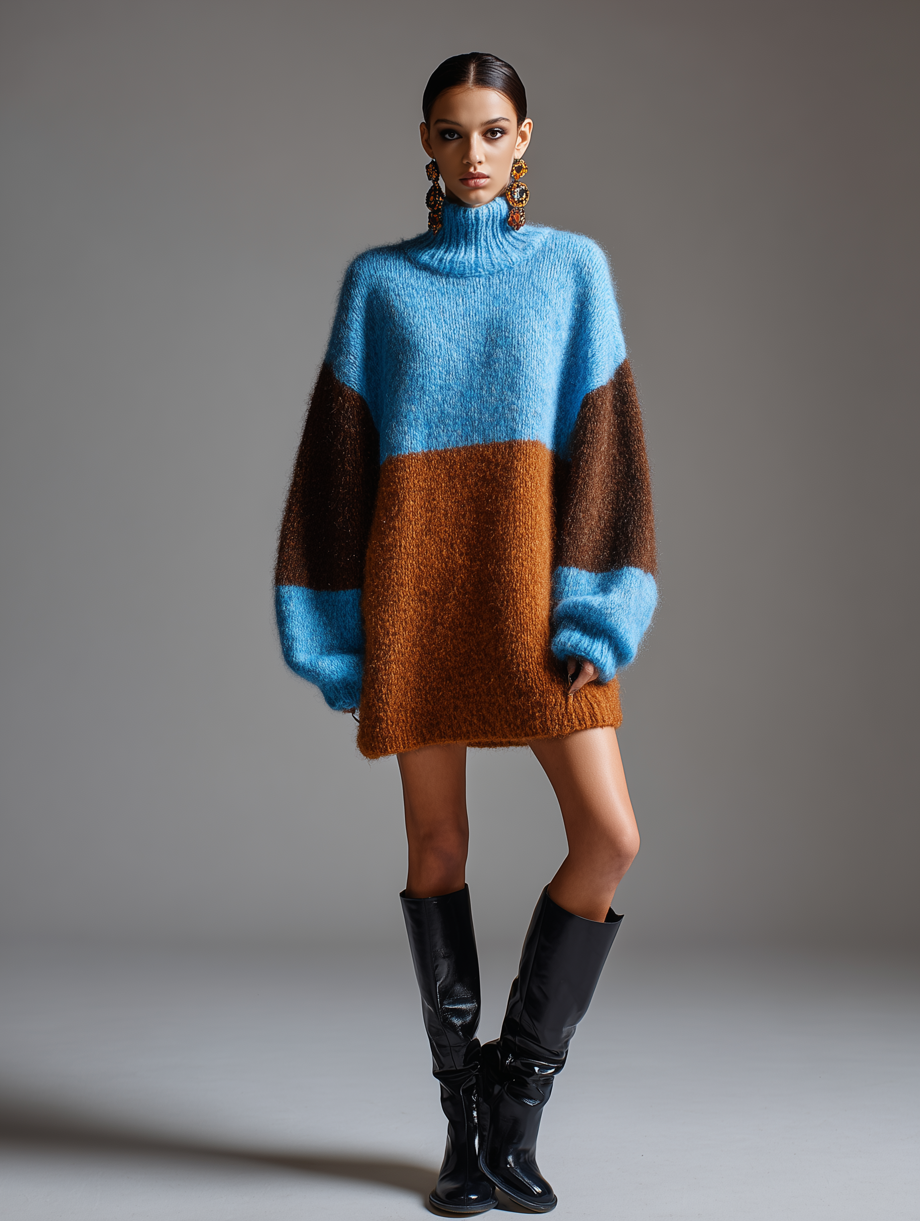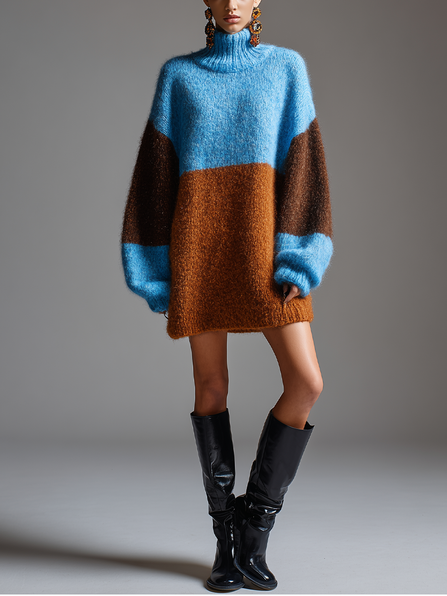 Women's Blue And Brown Color Block Knitted High-Neck Lantern Sleeve Mini Dress MDA0332K6T