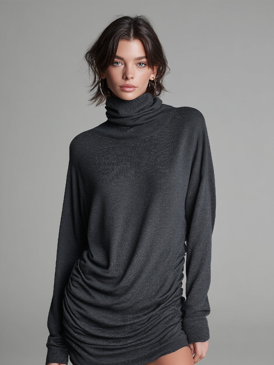 Women's Charcoal Knitted Casual-Chic Mini Dress With Turtleneck & Ruched Detailing, Effortless Street Style Mini Dress MDA3083J6I
