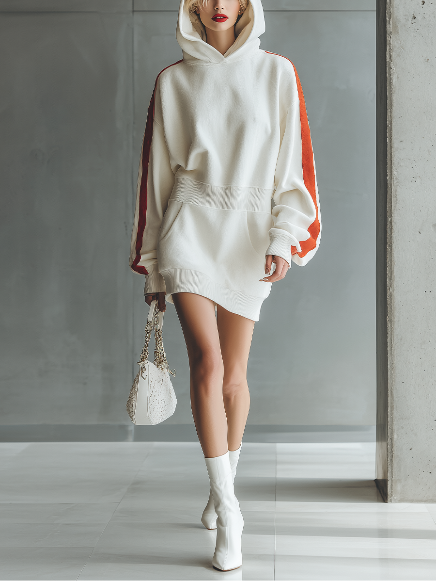 Women's White Cotton Blend Red Striped Loose Hooded Sweatshirt Mini Dress MDA2871J7T