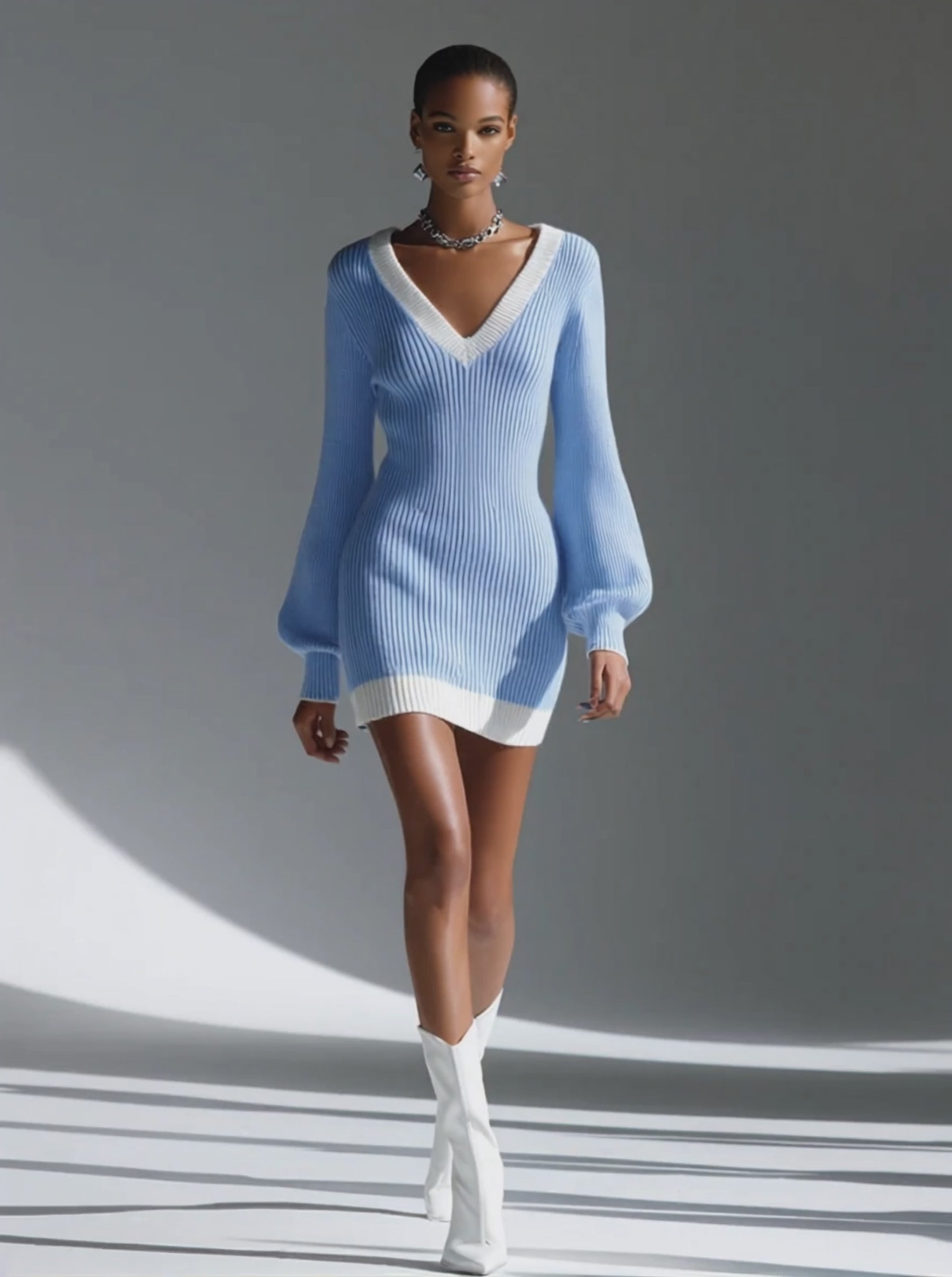 Women's Blue And White Color-Blocked Knit Mini Dress MDA0189L9AP