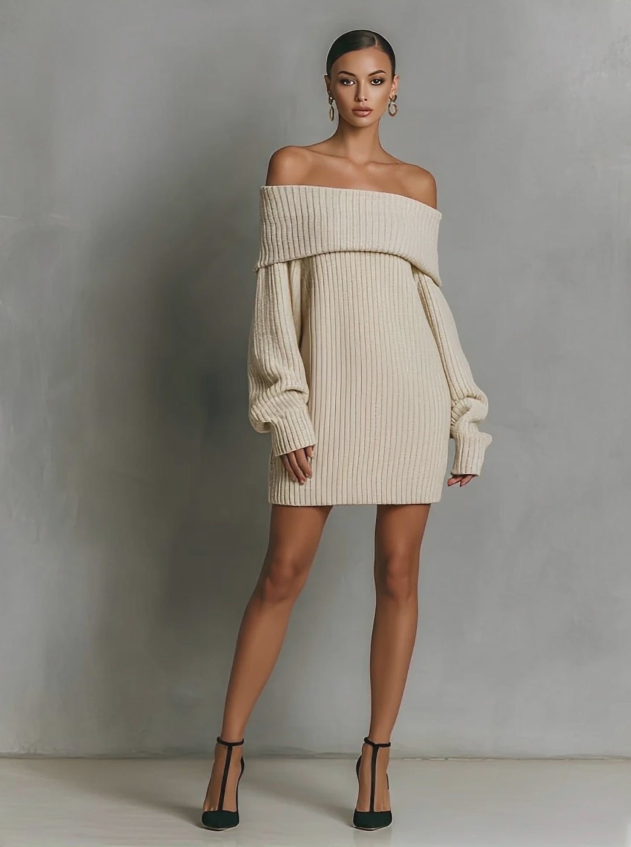 Women's Beige Elegant Rib Knit Off - Shoulder Oversized Sweater Dress MDA1697J2I