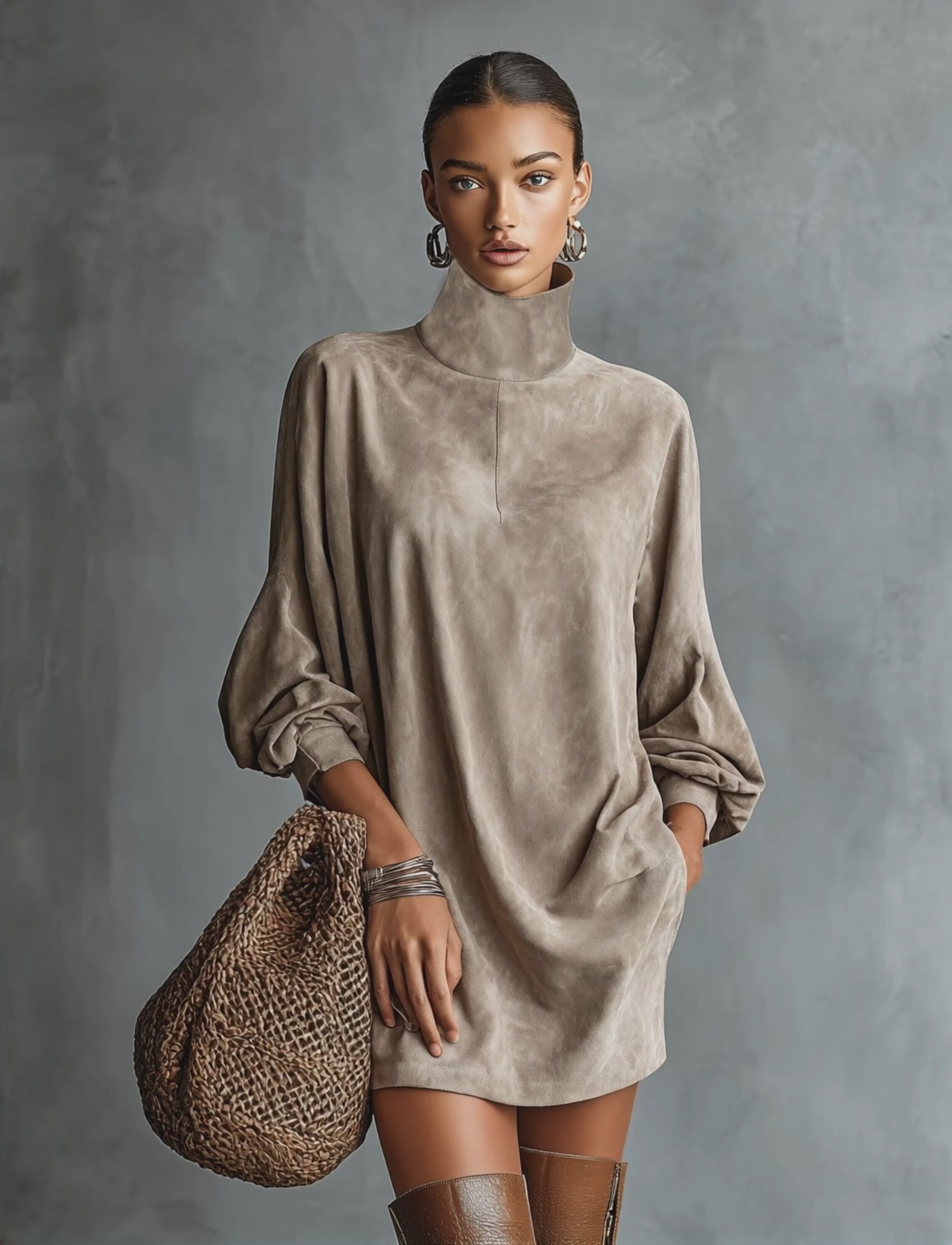 Women's Minimalist Loose-fitting Faux Suede High-neck Mini Dress MDA2423K1Y