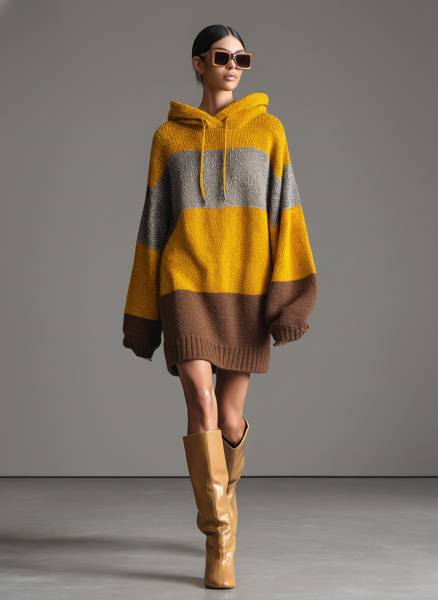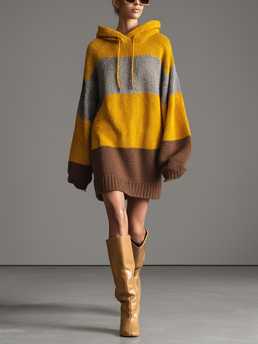 Women's Yellow, Brown And Gray Color-blocked Knitted Hooded Loose Sweater Mini Dress MDA0196K9T