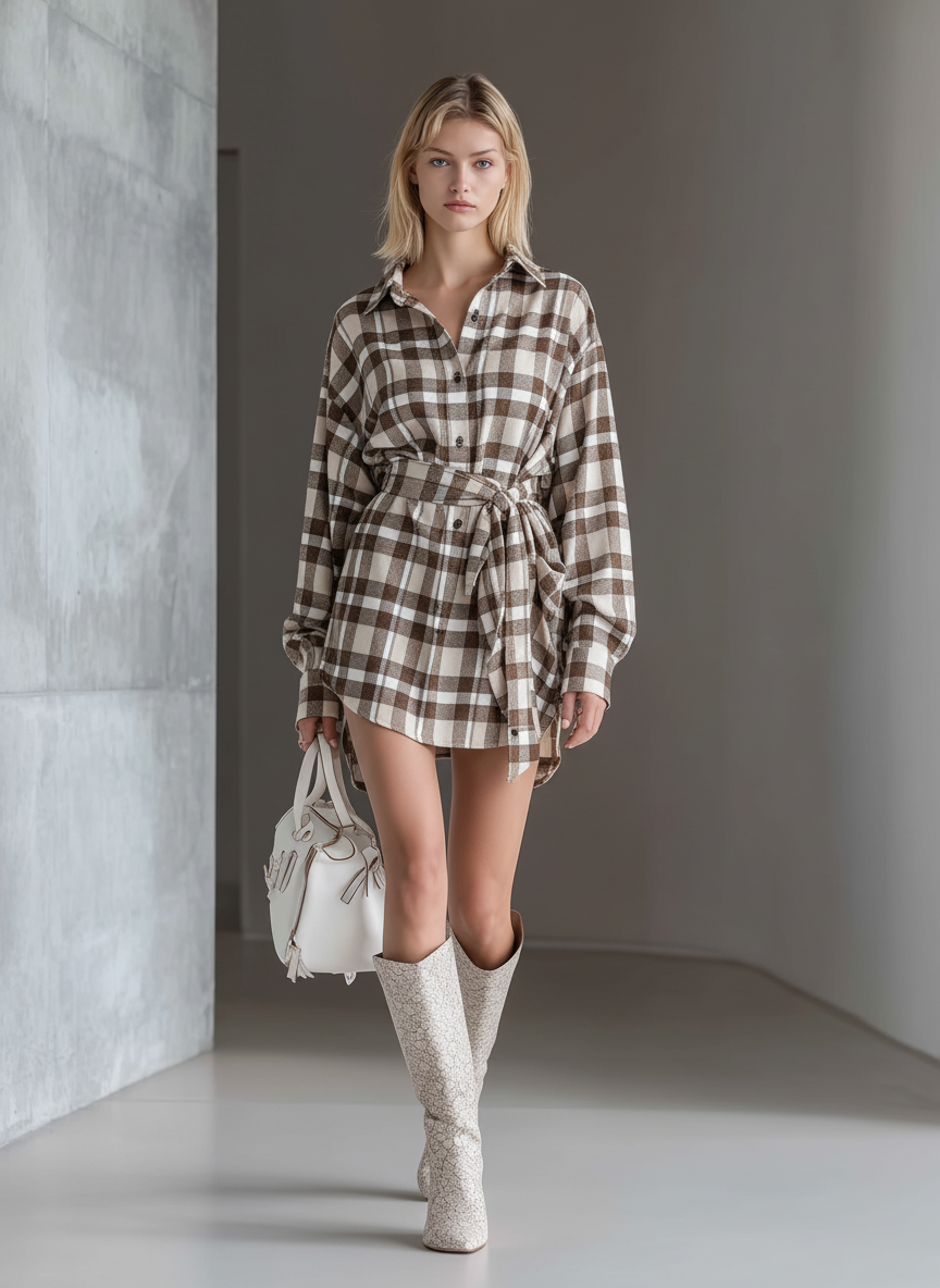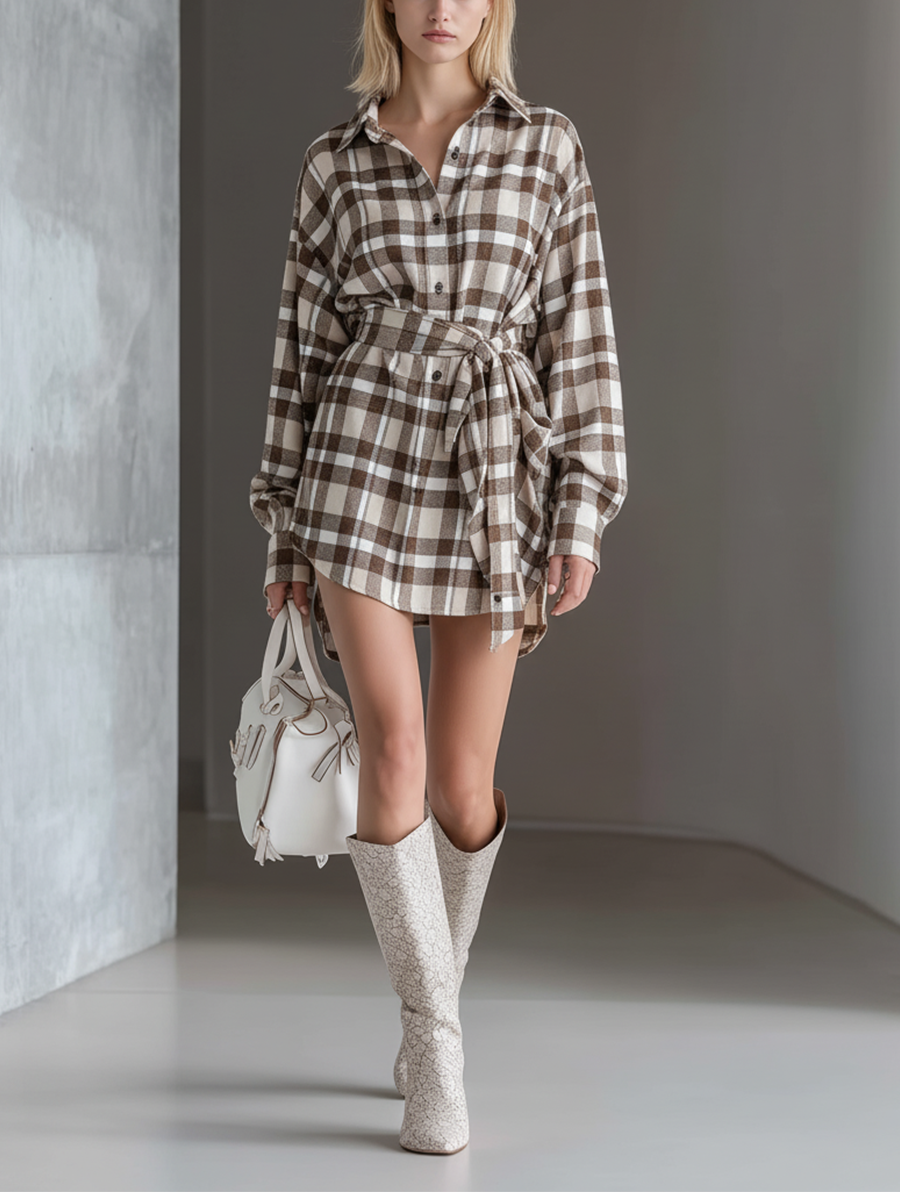 Women's Brown And Beige Plaid Cotton Blend Casual Mini Dress MDA2530J4T